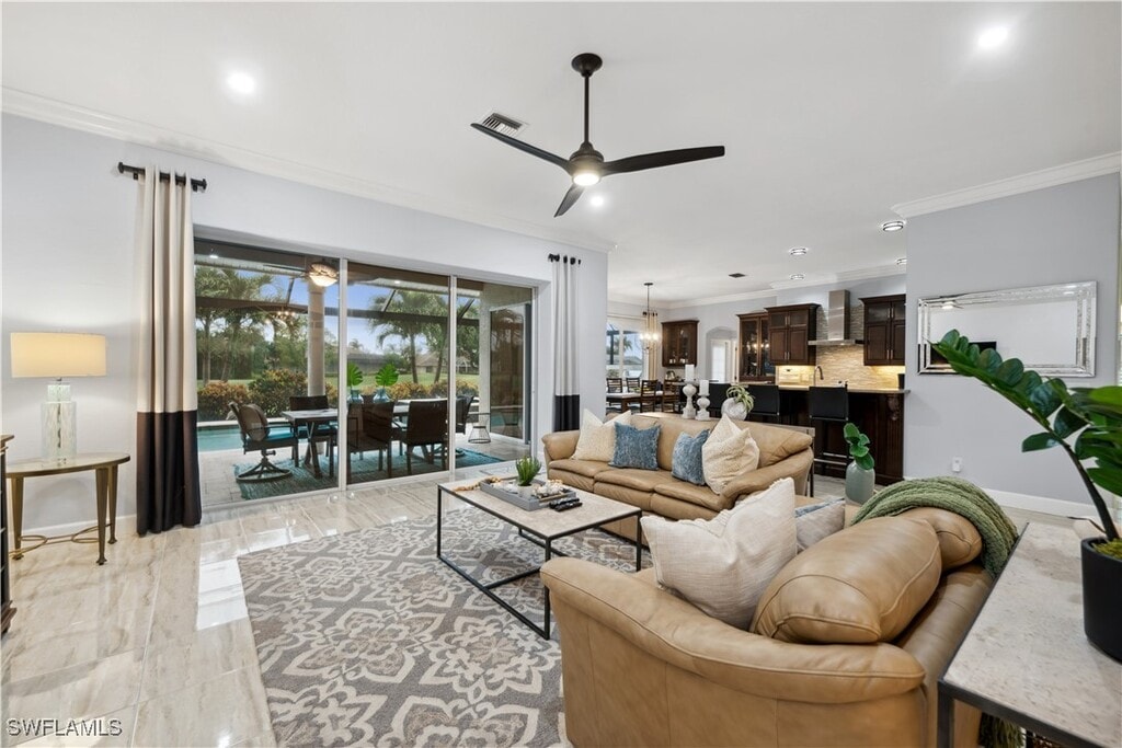 This exceptional pool home with plenty of room for family life & entertaining with 3 bedrooms plus a Den,2.5 bathrooms,2 car garage & 2,326 sf under air. From the double leaded glass entry into the foyer your view is direct through the sliders to the expansive heated pool & spa area framing the golf course view. The open floor plan features a gorgeous,updated kitchen features,JennAir & Bosch appliances,granite counter tops,glass tiled backsplash,breakfast bar & adjoining dining with built-in desk area. The sumptuous master bedroom suite offers direct lanai access & spa like bathroom with jetted tub,glass walk-in shower & separate sinks. This home has ALL the features you need – outdoor kitchen & travertine decking,luxury,neutral finishes,tall tray ceilings,crown molding,plantation shutters,custom window treatments,tile flooring throughout,newer interior paint & abundant natural light. Spanish Wells offers 24-hour gated security,fiber optic internet & included membership to Spanish Wells Country Club & Golf.