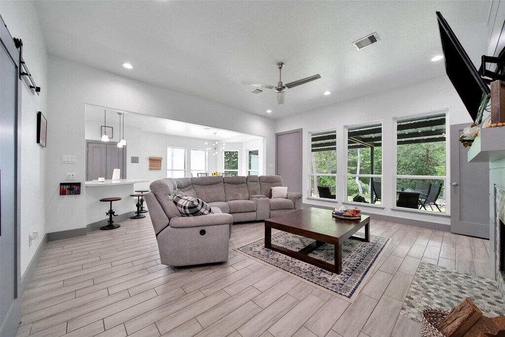 Welcome to this stunning property in The Commons on Lake Houston! Enjoy the canal front location in a quiet cul-de-sac. The fully fenced lot includes an automatic driveway gate and a spacious 35X30 shop perfect for your vehicles and toys. Modern exterior with custom finishes throughout - no attention to detail was missed! Three Bedrooms + an Office,Quartz Countertops,Soft Closing Cabinets & Drawers,Under Cabinet Lighting,Tile flooring throughout,Open Concept Main Living Spaces,ALL closets have built in dressers,Wood Burning Fireplace,High Ceilings,29X11 Covered Back Patio. Every detail is exquisite. Ready to stretch your legs? The community offers 30+ miles of trails,a pool,2 lake accesses with boat ramps,fishing pier,and parks. MLS# 8117046