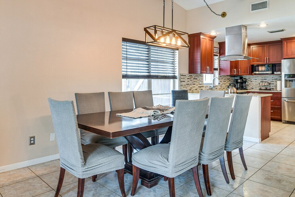 Feel at home in this Clearwater vacation rental, offering the perfect extended escape for families and traveling professionals eager to relax between beach days, remote work, and marina excursions. This stunning single-story home features step-free access, 3 bedrooms, and 2 bathrooms. This home invites guests to enjoy indoor-outdoor living at its finest. It features smart TVs, board games, a dining table, a breakfast bar, stainless steel appliances, a stove/oven, a refrigerator, a dishwasher, a microwave, a blender, a toaster, a water filter, a dual drip/pod coffee maker, a kettle, dishware/flatware, cooking basics, trash bags/paper towels, free Wi-Fi, central A/C and heat, ceiling fans, a washer/dryer, linens, bath and beach towels, an iron/board, and hangers. The outdoor area includes a private unheated pool, a gas grill, a gas fire table, a screened porch, a dining area, lounge seating, a fenced backyard, beach chairs and an umbrella, and an outdoor shower. Pets are welcome with a $70 fee, plus fees and taxes, with a maximum of one pet allowed and no dogs allowed. Driveway parking is available for 2 vehicles. Garage access is not available. Grab the provided beach gear and stroll the shores of Honeymoon Island. There are 2 exterior security cameras located at the front door facing the entrance and on the garage facing the driveway. The cameras are outward facing and do not look into interior spaces. The cameras record video and sound when activated by motion. No smoking, events, parties, or large gatherings are permitted. Guests must be at least 25 years old to book. A photo ID may be required upon check-in. Includes a laptop workspace. Guests will have access to the entire property via keyless entry. [SI]