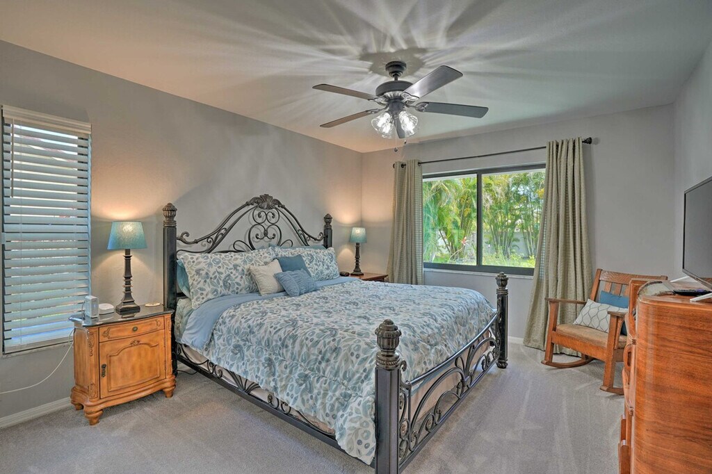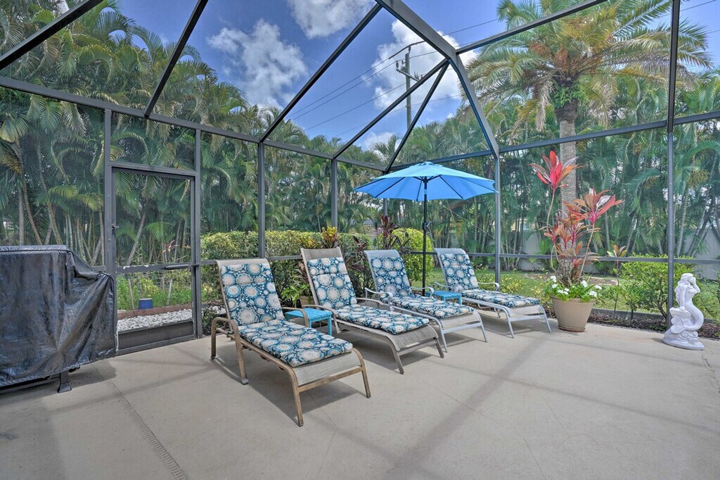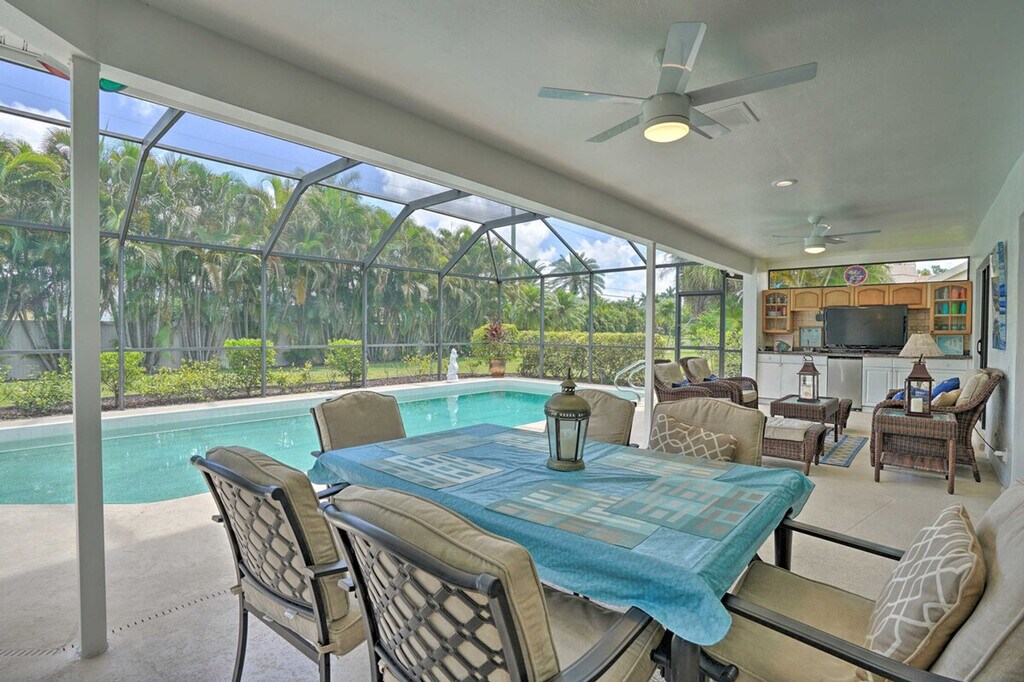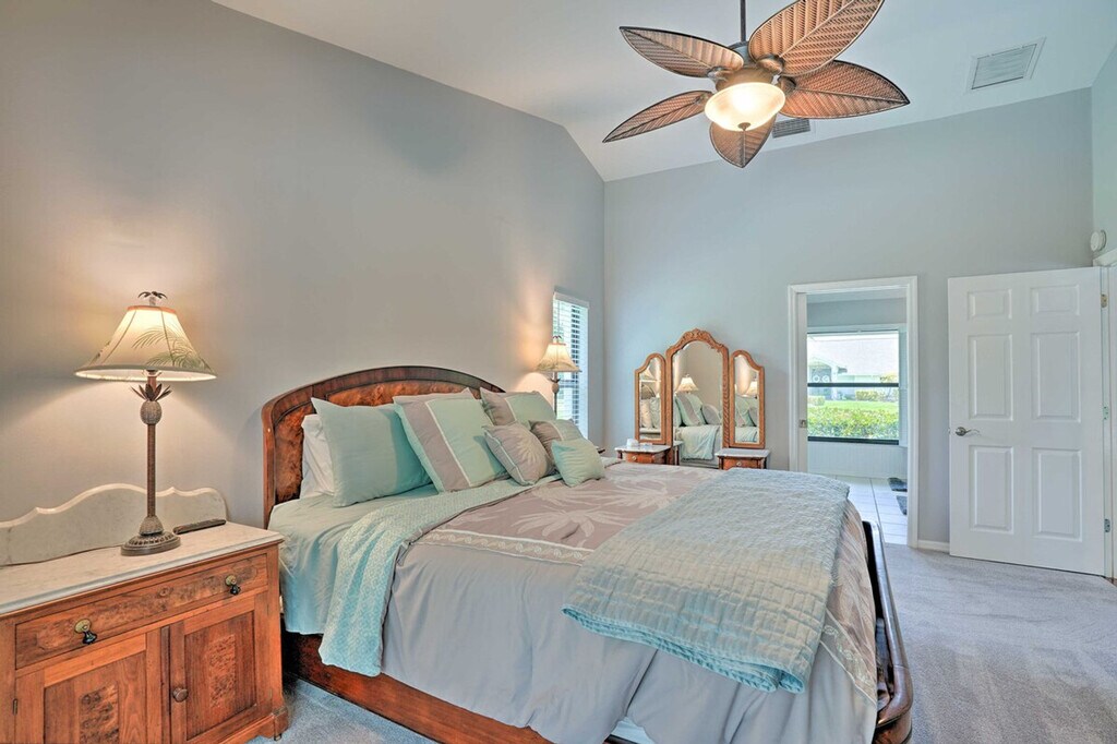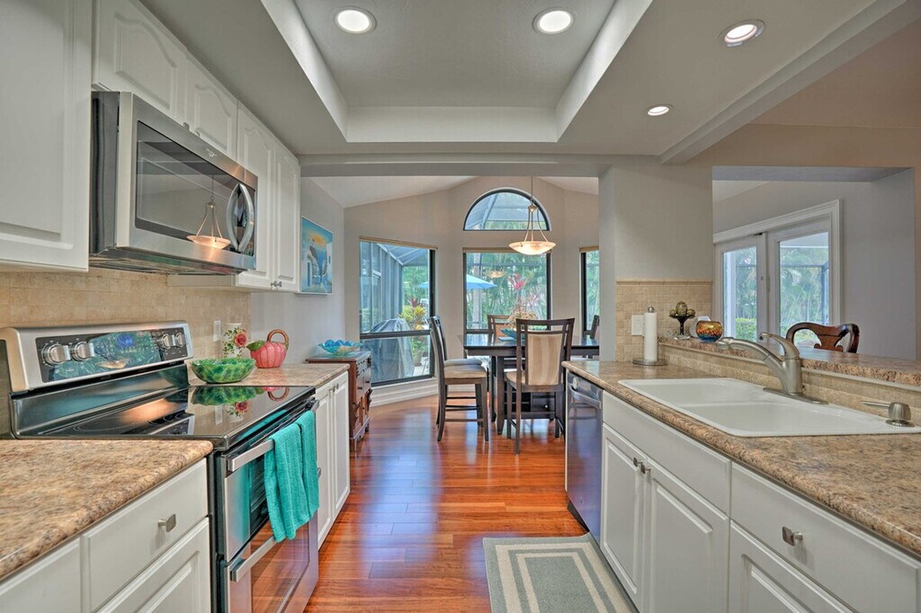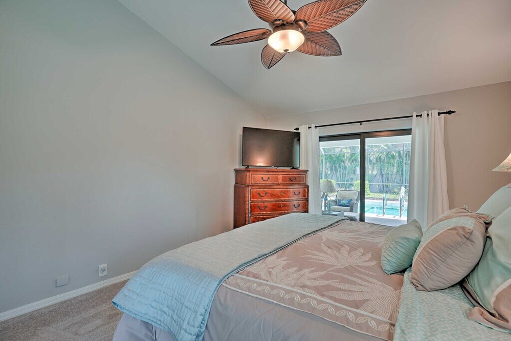 Feel at home in this updated 3-bedroom, 2-bath vacation rental home in the Bonita Springs gated community of Vanderbilt Lakes. This home requires one step for access. This tropical Florida home features free Wi-Fi, a large, very private saltwater pool, and a gas grill. The screened-in lanai, patio furniture, outdoor dining area, wet bar, and beach chairs ensure every minute of Florida's phenomenal weather can be enjoyed. Inside, you'll find 2 Smart TVs with cable, a DVD player, an open floor plan, a dining table, ceiling fans, books, and a desk workspace. The fully equipped kitchen includes a drip coffee maker, blender, toaster, ice maker, spices, and dishware/flatware. Also included are central air conditioning, a washer and dryer, linens, and towels. There is an optional daily pool heat fee that can be applied to the entire stay. Dreamy Southwest Florida awaits you and your family or friends when you book a stay at this home, centrally located near attractions including Bonita Beach, Lovers Key State Park, Naples, and Fort Myers Beach. Smoking, pets, events, parties, and large gatherings are not allowed. Quiet hours should be observed after 10:00 pm. Guests must be at least 25 years old to book. [SI]