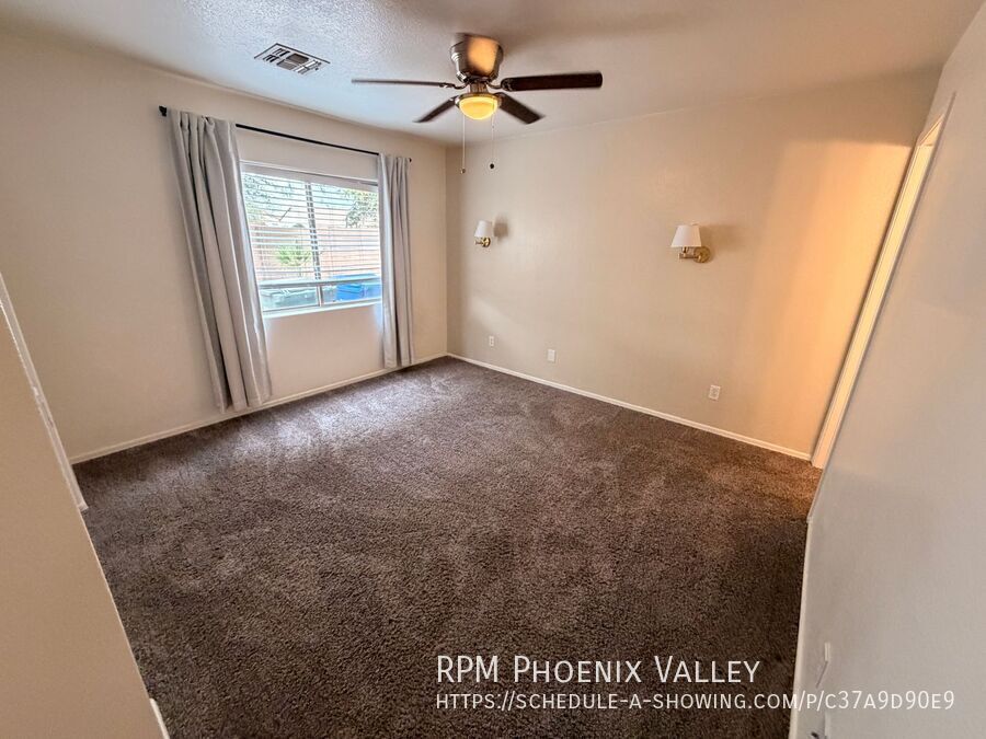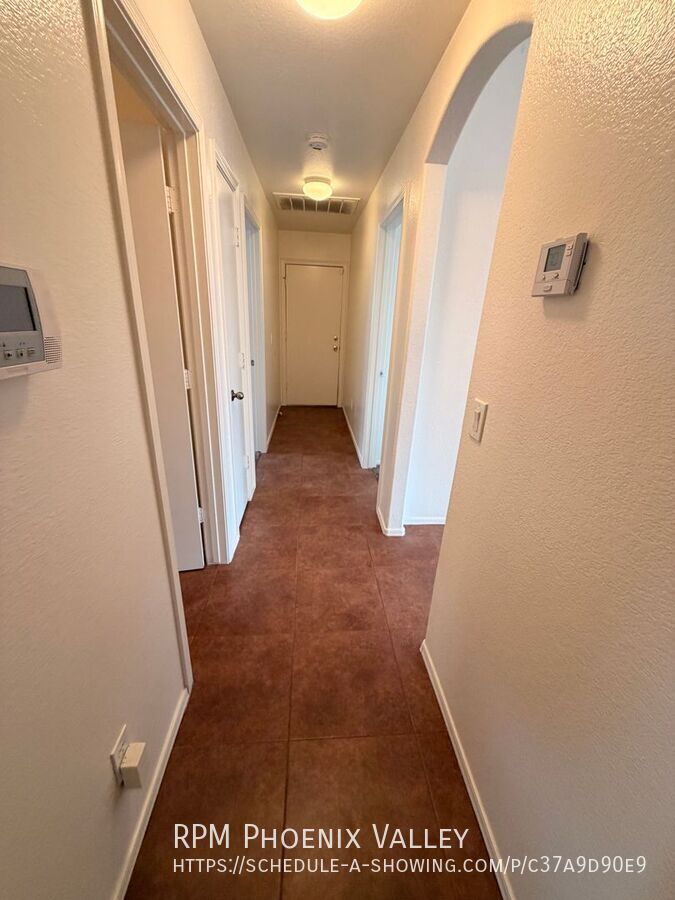 Welcome to this 3-bedroom, 2-bathroom home featuring tile flooring throughout the main living areas and carpet in all bedrooms for added comfort. You will step into the large living room with vaulted ceiling that continues into the dining room kitchen area with a beautiful gold chandelier. The kitchen offers modern dark gray cabinetry, tiled backsplash behind the stove, all appliances and plenty of counter space. The primary suite has large double door closet and an en-suite bathroom with a nicely decorated wall tile, gold framed mirror and tub/shower combo. Two secondary bedrooms share a hallway bathroom and include ample closet space. A sliding glass door leads to a covered patio overlooking a large, fully fenced backyard. The home also includes white interior paint that goes with any decoration and washer/dryer is in the two-car garage. Conveniently located near the 202 and I-10 with easy access to shopping, dining, and parks. Up to two (2) spayed/neutered pets permitted with an additional $350 deposit per pet. We do not list on CRAIGSLIST OR FACEBOOK MARKETPLACE SO IF YOU SEE IT ON THERE IT IS A SCAM $50.00 non-refundable application fee per person, age 18 or over. Full security deposit of $1599 is due upon approval. Move in date must be between 7 & 30 days from lease signing/payment of security deposit. If moving in on or after the 5th then pro-rated current month rent is due as well as the following full month. All rent is due 7 days prior to move in. 2 Car Garage Fridge Range/Stove Security Alarm Sprinklers Washer/Dryer