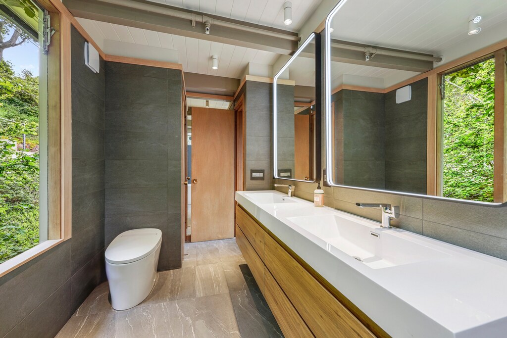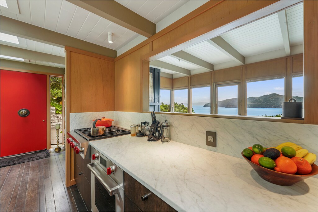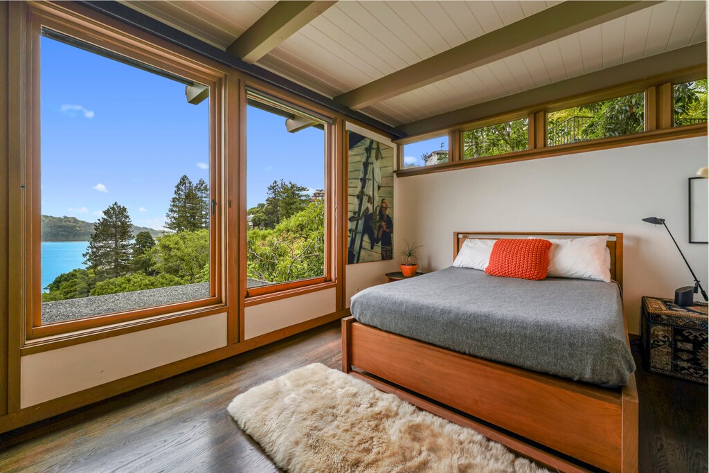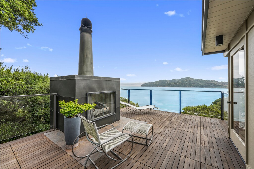 Perfectly positioned to capture sweeping views of Angel Island and the serene waters of the San Francisco Bay, this elegant Belvedere residence is a offered fully furnished. This home fuses Mid-Century and International Style framework with curated contemporary style sensibility. Every room in the home showcases breathtaking vistas, creating a beautiful backdrop that shifts throughout the day, while capturing abundant light. The interiors reflect a thoughtful renovation that honors the original architectural spirit—clean lines, open flow, and natural materials—while introducing modern design elements, age-appropriate furnishings, and an art collection that adds sophistication, atmosphere and warmth. The top-floor primary suite opens to a private balcony with a cozy fireplace, created in order to unwind while watching the fog roll across the Bay, or admiring the first lights of the day. Above the home, a bocce court offers elevated views and an additional space for entertaining, while surrounded by a thoughtfully landscaped slope. The home also includes a garage for convenient parking or storage. Offered fully furnished, this is a fantastic opportunity to enjoy meticulous and timeless design, modern comforts, and unforgettable views.