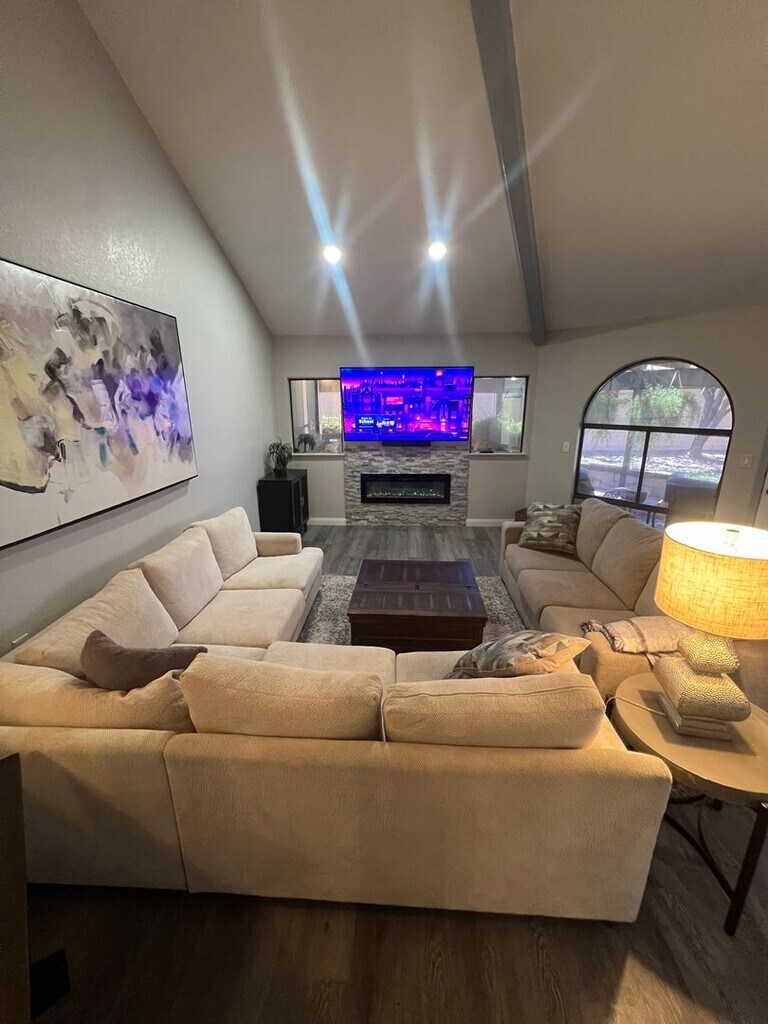 This beautifully maintained 2-Bedroom, 2-Bathroom, 2-Car Garage fully furnished townhome offers comfort and convenience with thoughtful upgrades throughout. Luxury vinyl plank flooring extends through every room, including all wet areas, combining durability with modern style. The open-concept family room flows seamlessly into the kitchen, which features tile countertops and comes complete with all appliances. From the living and dining areas, enjoy views of a lovely grassy outdoor space that adds a sense of relaxation and openness. The spacious two-car garage provides added convenience, and the single-story floor plan ensures easy living. Please note that the rent includes a $100/Mo for Sewer, Trash, and the Resident Benefit Packet.(RBP), WHICH INCLUDES LIABILITY INSURANCE, HVAC FILTERS, THE RESIDENT REWARDS PROGRAM, CREDIT BUILDING, IDENTITY PROTECTION, HOME BUYING ASSISTANCE, A CONVENIENT AND EASY-TO-USE ONLINE PORTAL, AND A VETTED VENDOR NETWORK. DON'T MISS OUT ON THIS INCREDIBLE OPPORTUNITY! Please call with any questions.