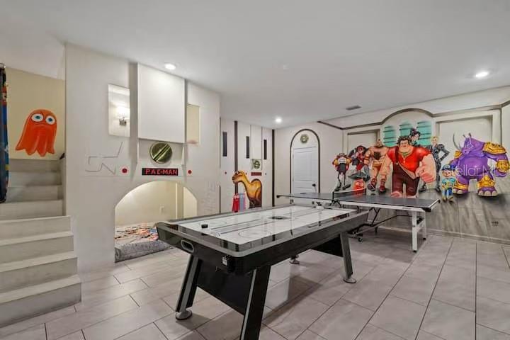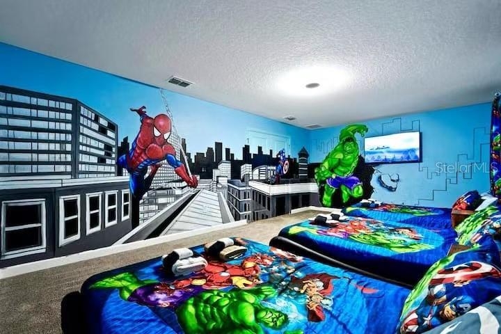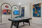 WELCOME TO PARADISE and luxury living at Storey Lake Resort! This meticulously maintained themed vacation home features 9 bedrooms and 5 full bathrooms. The Game Room and many of the Bedrooms are Disney themed and hand-painted mural. Very fun for the whole family! This property is a dream vacation home . First floor features include: Inviting entrance foyer,Primary bedroom with en-suite bathroom,large game room with 3 game tables and large screen TV,2nd Bedroom and 2nd full bathroom,spacious gourmet kitchen with breakfast bar,large closet pantry,open floor plan with Great Room and Dining Room. Sliders to the 40 X 10 covered patio and screen enclosed swimming pool with spa ... overlooking the beautiful water pond! Second floor features include,open loft media room,inside utility closet with washer and dryer ... and 7 more bedrooms and 3 more full bathrooms! Every detail has been thoughtfully designed to create an atmosphere of indulgence and relaxation and perfectly caters to the needs of large families,groups of friends,or anyone seeking a lavish and spacious retreat. Storey Lake Resort itself is known for its exclusive amenities,making it a true gem among vacation communities. Residents and guests have access to the communities recreational facilities,including a clubhouse,fitness center,water park,sports courts,and much more. Orlando's most famous attractions ( Disney World,Universal Studio,Old Town,SeaWorld...),restaurants,and shopping centers are just minutes away. East coast beaches and the Gulf of America are a little over an hour away. Call today to preview this amazing home! MLS# O6359235