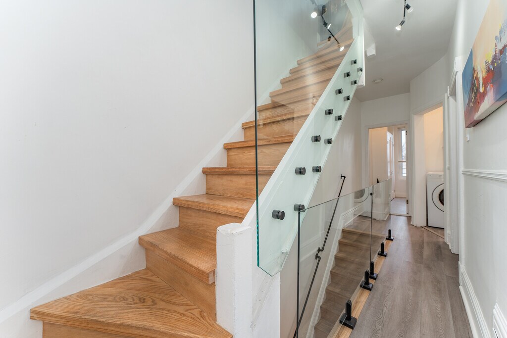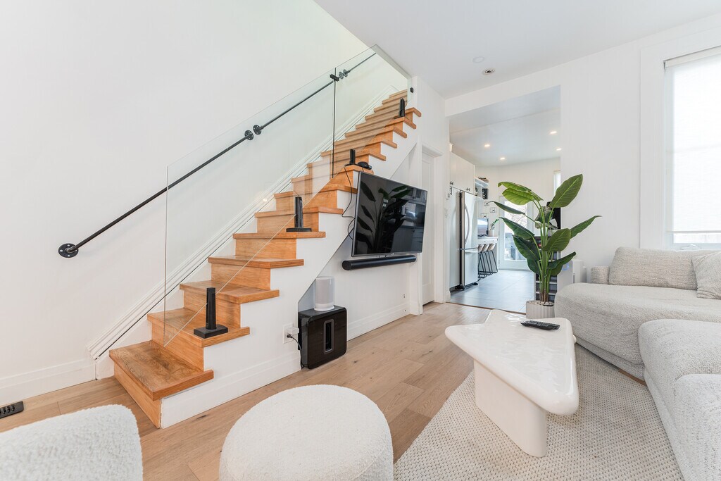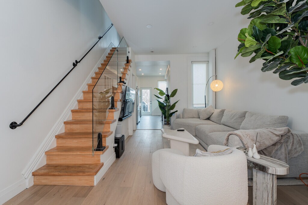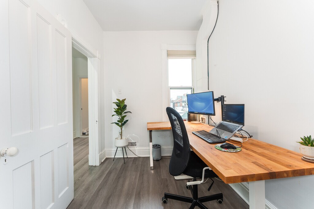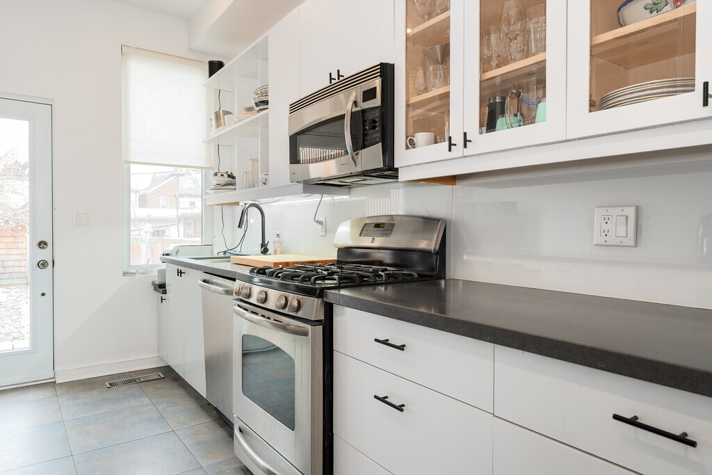 Fantastic 3-Storey renovated victorian gem tucked away in downtown's coveted Trinity Bellwoods. Open concept home with plenty of windows and light - enjoy original features: brick fireplace, exposed brick walls, pot lights, wood floors and glass railings throughout. Dining room and living room are spacious with 9.5 feet ceilings and bring you in to the modern kitchen with a large builtin desk, cabinet lighting, stainless steel appliances and 4 burner gas stove. The deck leads you to your private backyard with cobblestones, gardens and fairy lights. A bright second floor contains 2 good sized bedrooms with windows and closets, laundry room and beautifully upgraded 5-piece bathroom with built in cabinets. You'll love the third floor showcase loft - completely open, this primary bedroom offers you 7.5 feet vaulted ceilings, exposed brick walls, a built in closet, ensuite bath and walk out to your second private sun-soaked deck. The modern bedroom soaker tub allows you to indulge as you would a spa. This is the perfect elegant home for working professionals. Book now before this one is swiped up! Fireplace is decorative only.