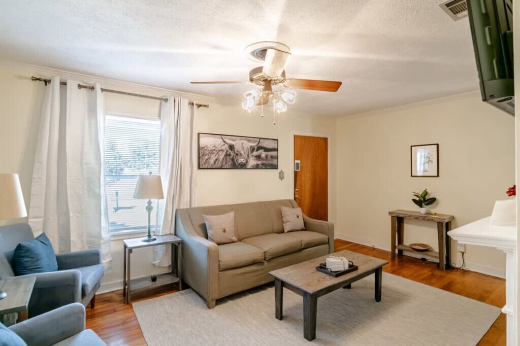 This lovely 3-bedroom, 2-bathroom single-family home is located in Dauphin Acres near Midtown and can accommodate up to 12 guests. Tastefully designed with convenience in mind, it boasts a spacious living room with a comfortable sofa bed. The kitchen is equipped with essential amenities for meal preparation. All bedrooms feature comfy beds for a restful night's sleep. Enjoy lounging in the backyard or head downtown, which is only 15 minutes away. Guests will enter the house through a digital keypad, with a few stairs leading to the main entrance. Inside, you'll find a living room with a decorative fireplace. On the right side of the living room, there is a bedroom with a private bathroom. Off the living room, there is a dining room and a kitchen. A hallway on the left side of the kitchen area leads to two bedrooms and another bathroom. Outside, enjoy a nice backyard with a charcoal grill. A pack 'n play/travel crib is available upon request. Pets are welcome with a non-refundable pet fee. Pets must be crated when left unattended and are not allowed on furniture or beds. All waste must be cleaned up from the yard. If there is evidence of pet hair on the furniture, excess hair in the home, stains, or waste found in the yard or home, you will be charged the cost to clean this. The home is located in Dauphin Acres, just outside of Midtown, across the street from Denton Park, and near McGrew Court Park. Conveniently situated between Spring Hill Dr. and Government Blvd, you'll have easy access to everything. The home has quiet hours between 10 PM and 7 AM. If you violate quiet hours and disturb the neighbors, your reservation will be canceled, and you will be required to leave the property immediately without a refund. Smoking is prohibited, and if any signs of smoking are found, a $500 damage charge will be incurred. Parties are not allowed, and any damage to the home or its furnishings during your stay will be your responsibility. Trash must be bagged and placed in the bins provided, with a $100 charge for third-party trash removal if excessive trash is left. [SI]