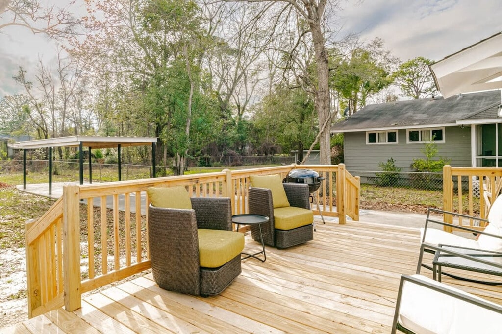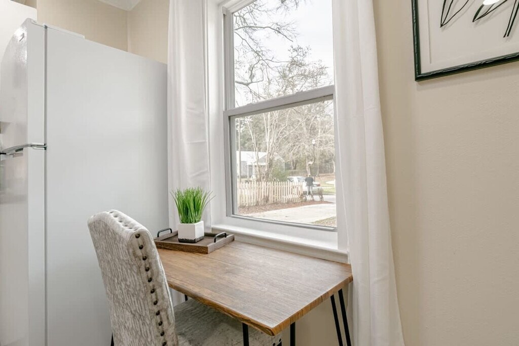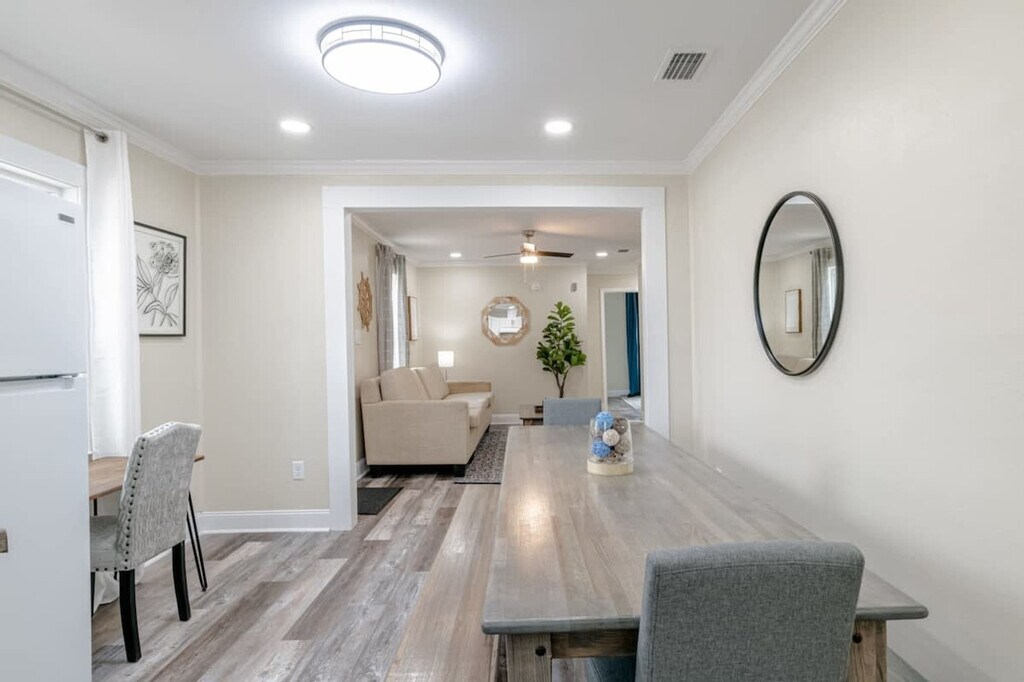 Feel at home in this newly renovated and spacious 4-bedroom, 2-bathroom home, comfortably accommodating up to 12 guests. The property features a fully equipped kitchen, a fenced backyard with a deck, and a washer and dryer for a home-like stay. Located just outside midtown, you're minutes from restaurants and groceries, and less than five miles from downtown. Enter through the front door using a digital keypad into the living room, with the dining room and full kitchen to your right. The living room includes a queen sofa bed and a large Smart TV. The dining space and kitchen are equipped with all essential kitchen items and a beautiful handmade farm table. The first bedroom, located behind the living room, is furnished with a queen bed. A full bathroom with a dual vanity and a shower/tub combination is nearby, along with the washer and dryer. The second bedroom also features a queen bed. Down the hall, the third and fourth bedrooms are spacious, with the third bedroom offering a queen bed and sitting area, and the fourth bedroom containing two queen beds and a Smart TV. The second full bath separates these two rooms and includes a shower/tub combination. Outside, enjoy a large fenced yard, deck, patio furniture, and grill. A pack 'n play/travel crib is available upon request. Pets are welcome with a non-refundable pet fee. Pets must be crated when left unattended, are not allowed on furniture or beds, and all waste must be cleaned up from the yard. Additional cleaning fees apply if pet hair or waste is found. Situated in Dauphin Acres, just outside of Midtown and across the street from Denton Park, this home offers convenient access to everything. Located between Spring Hill Dr. and Government Blvd, you're well-positioned for easy travel. This home offers contact-free check-in via a digital door code, ensuring maximum privacy. Quiet hours are between 10 PM and 7 AM. A $500 damage charge applies if smoking is detected in or around the home, or if cigarette butts are found outside. Parties are prohibited, and events require prior approval. Excessive noise may result in reservation cancellation without refund. Guests must be at least 21 years old to rent this property. A $100 charge applies for excessive trash removal. [SI]