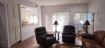 JUST LISTED!! AVAILABLE JANUARY 1. FURNISHED 2BR 2BA condo. PUBLISHED PRICE OF $2400 IS FOR A 1-YEAR LEASE. ALSO AVAILABLE JAN-APRIL 2026 AS A SEASONAL RENTAL AT $4200/MO. Large central living area opens to large patio facing Southeast,the golf course,overlooking the fairway and lake at the Lagos #2 golf hole. 9 foot ceilings. Freshly painted. Located just steps from your own semi-private pool and spa. Includes 1-car garage and golf cart parking spot. Tenant pays utilities,but Spectrum CATV,internet and wifi is included,as is full access to resort amenities,country club,fitness center,tennis and golf (green fees are extra). Desert Princess Palm Springs is a luxurious resort close to freeway,downtown Palm Springs and Palm Desert.