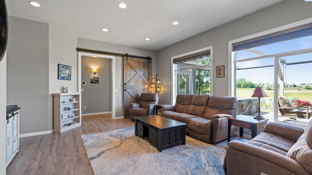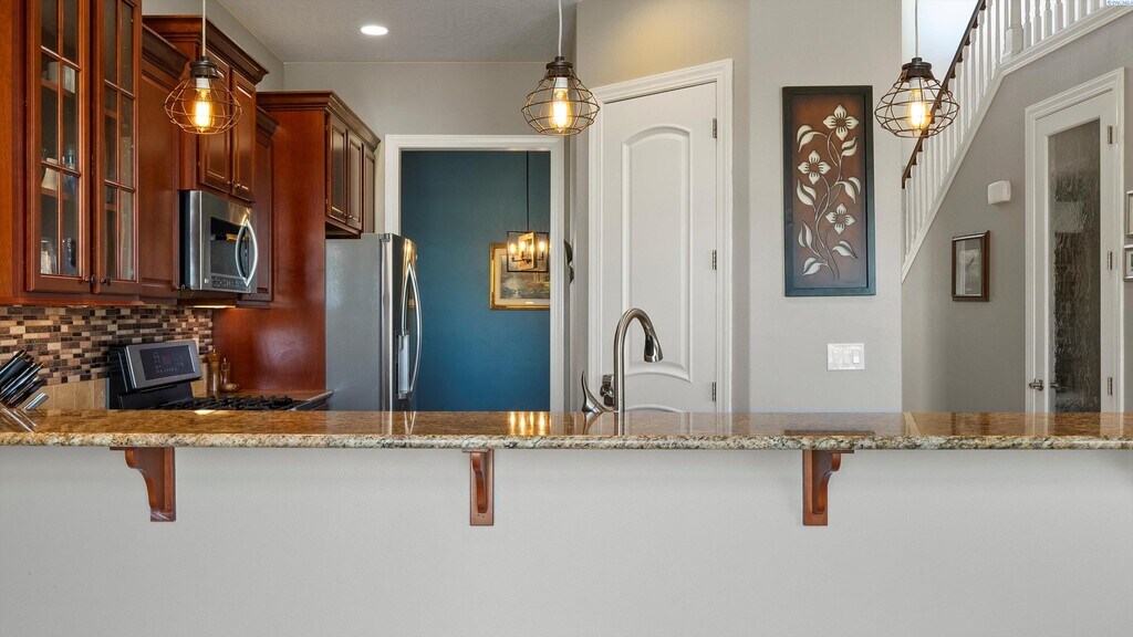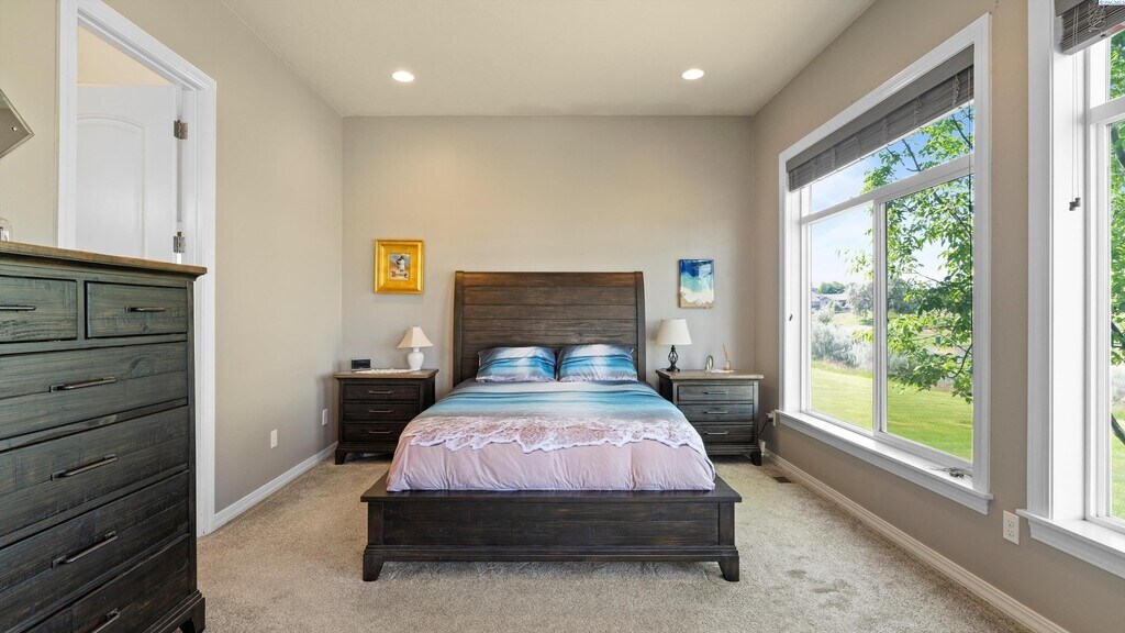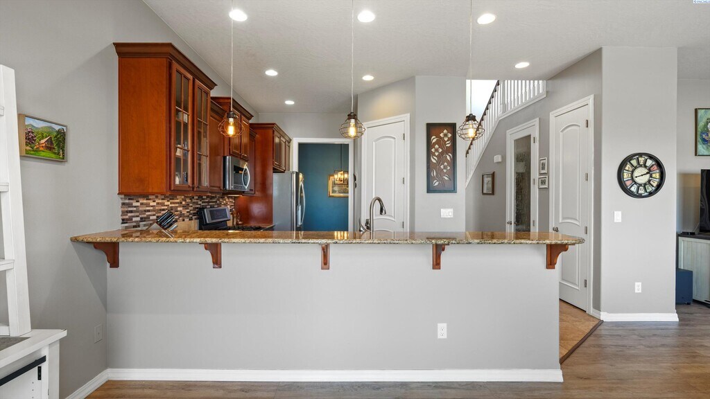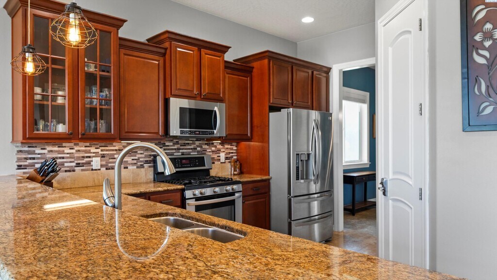 Come see this home, fall in love and make an offer. Sellers are willing to cover closings costs and/or consider all reasonable offers. You’ll fall in love with this 2-story custom home perched above the 18th fairway in the coveted Horn Rapids Golf Community! Offering over 3,000 sq ft of well-planned living space, this home combines elegance, comfort, and practicality in a tranquil setting. Enter through a dramatic vaulted foyer with tile flooring, leading to a formal dining space and an expansive open-concept family room accented by durable laminate wood floors and oversized windows showcasing the views. The kitchen highlights timeless style and utility with granite counters, a large breakfast bar, stainless appliances, tile floors, rich wood cabinetry, and a walk-in pantry—ideal for hosting or daily life. The main-level owner’s suite is a private haven, offering French doors to the back deck, an oversized closet, dual granite vanity, soaking tub, and walk-in shower. From your deck, take in stunning views of desert landscaping and wildlife, or relax in the tucked-away hot tub just outside the suite’s doors. Designed with ease and durability, all primary living areas are on the main level—including an office, guest bath, and laundry—while the upper floor has three more bedrooms, a full bath, and a large bonus room with sweeping views, perfect for guests, hobbies, or play. This home is packed with upgrades—whole-home audio wiring, CAT5 cabling, a 3-car garage, and storage galore. Outside, enjoy lush landscaping, vibrant flower beds, and a serene setting that changes with the seasons. Just a short stroll to all Horn Rapids amenities—community pool, clubhouse, tennis & pickleball courts, parks, RV parking, and miles of walking paths—this residence offers the best lifestyle for golfers, outdoor lovers, and anyone seeking both comfort and sophistication in one of North Richland’s premier neighborhoods.