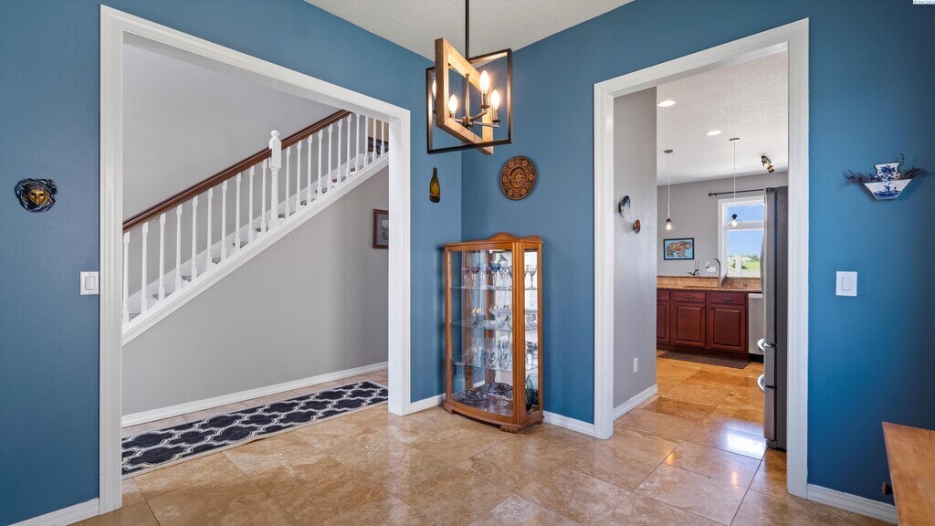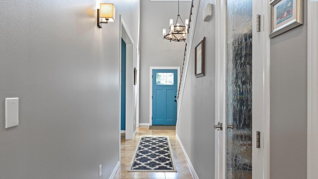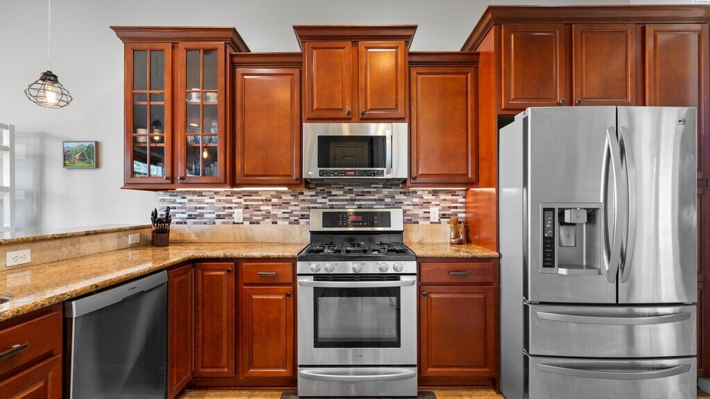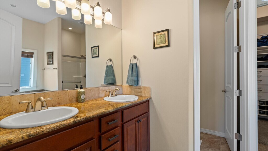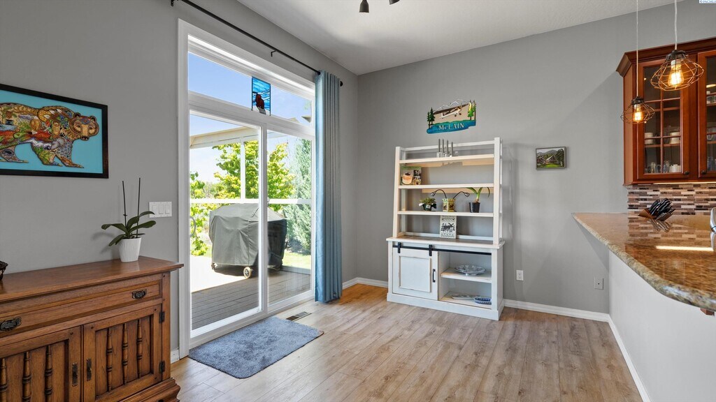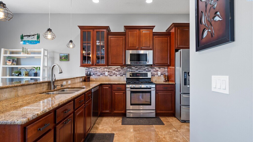 Come see this home, fall in love and make an offer. Sellers are willing to cover closings costs and/or consider all reasonable offers. You’ll fall in love with this 2-story custom home perched above the 18th fairway in the coveted Horn Rapids Golf Community! Offering over 3,000 sq ft of well-planned living space, this home combines elegance, comfort, and practicality in a tranquil setting. Enter through a dramatic vaulted foyer with tile flooring, leading to a formal dining space and an expansive open-concept family room accented by durable laminate wood floors and oversized windows showcasing the views. The kitchen highlights timeless style and utility with granite counters, a large breakfast bar, stainless appliances, tile floors, rich wood cabinetry, and a walk-in pantry—ideal for hosting or daily life. The main-level owner’s suite is a private haven, offering French doors to the back deck, an oversized closet, dual granite vanity, soaking tub, and walk-in shower. From your deck, take in stunning views of desert landscaping and wildlife, or relax in the tucked-away hot tub just outside the suite’s doors. Designed with ease and durability, all primary living areas are on the main level—including an office, guest bath, and laundry—while the upper floor has three more bedrooms, a full bath, and a large bonus room with sweeping views, perfect for guests, hobbies, or play. This home is packed with upgrades—whole-home audio wiring, CAT5 cabling, a 3-car garage, and storage galore. Outside, enjoy lush landscaping, vibrant flower beds, and a serene setting that changes with the seasons. Just a short stroll to all Horn Rapids amenities—community pool, clubhouse, tennis & pickleball courts, parks, RV parking, and miles of walking paths—this residence offers the best lifestyle for golfers, outdoor lovers, and anyone seeking both comfort and sophistication in one of North Richland’s premier neighborhoods.