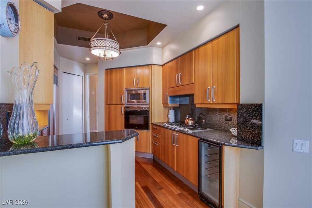 Sophisticated and elegance can be found in this ground-level 2 bed/2 bath condo at Tower 1 Turnberry Place. The spacious living area flows seamlessly throughout with direct access to an outside wrap around balcony, perfect for entertaining or evening relaxation. Kitchen is equipped with built-in-appliances, plenty of cabinet space and a well-appointed breakfast nook. Primary suite has a spacious walk-in closet and even includes en-suite bathroom with separate jacuzzi tub, walk in rain shower and dual sinks. Residents of Turnberry Place have access to resort-style amenities from pool, spa, private fitness center, guard gated entry, on site valet and concierge service! Perfectly located only minutes from the I15 freeway, vibrant Downtown area, and Las Vegas Strip.