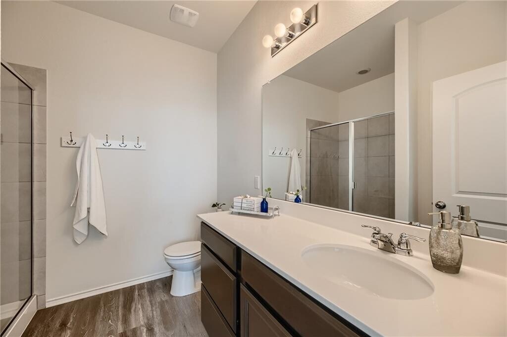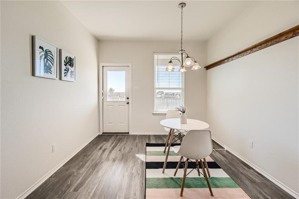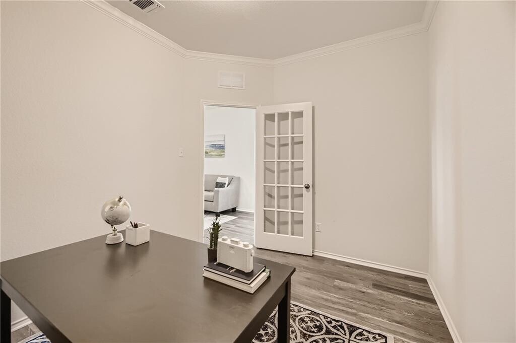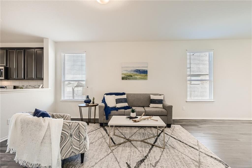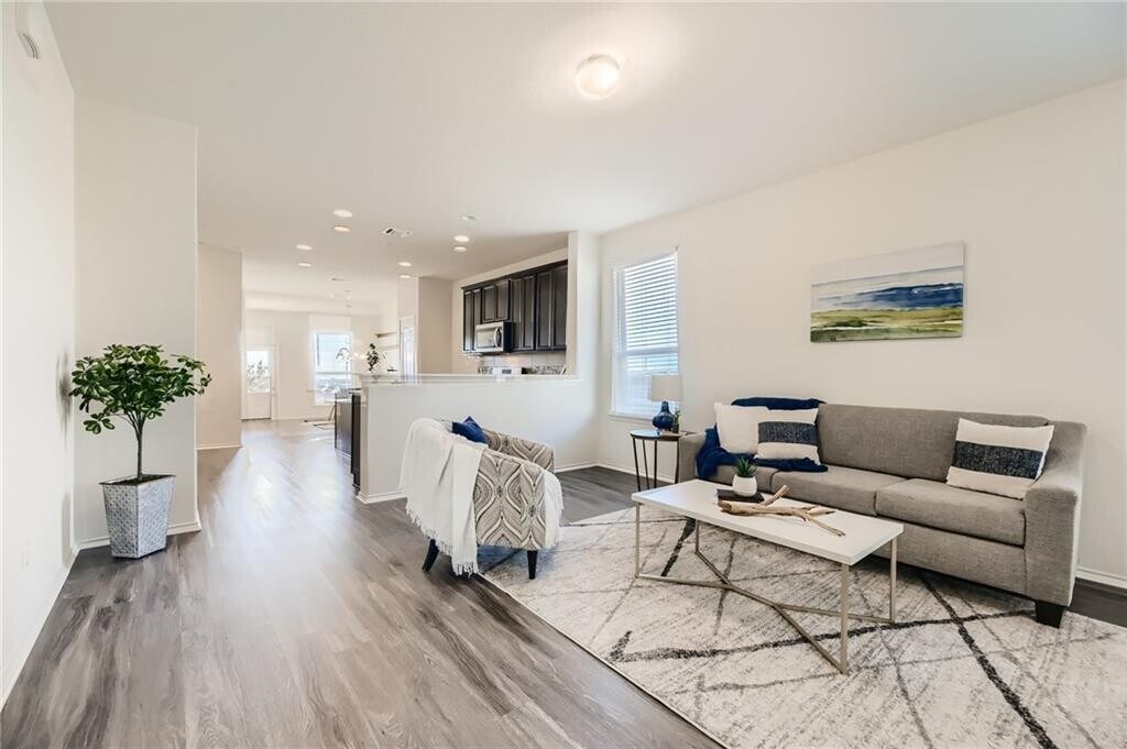 This immaculate, open floor plan, 1517 sqft Pulte home, is a Sunfield gem situated on a cul-de-sac lot offering both spacious back and side yards. 3 BD, 2 BA + bonus room located behind French doors right off the living room, which would make a perfect home office. You'll appreciate the extended, covered patio overlooking the roomy, fenced private backyard. Besides the award-winning schools and it's quick access to I-35, Sunfield boasts awesome amenities such as a lagoon-style pool, lazy river, and union olympic pool. There are a multitude of hike & bike trails as well as amenities for the pups!