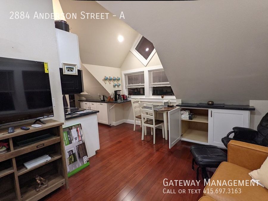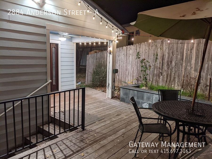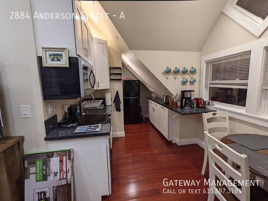 Great room features a vaulted ceiling and woodsy view corridors The kitchen is small with custom wood cabinets, granite counter tops, microwave hood, flat top electric stove. The 24" refrigerator is included. Large bedroom with lots of light and a bigger closet Oversized Split mini-pump uses refrigeration technology to cool or heat quickly. Three overhead fans circulate the air quickly. The bathroom has its own electric heater Beautifully tiled bathroom with large walk-in shower Large sunny private deck with 200 sqft of ironwood with surrounding planters. There is a gas BBQ Table for 4 and other outdoor furniture Garage has a laundry room shared with a contractor who lives in the big house and is in process of remodeling his unit. Possible to park two cars Partial furniture- We can store in garage- Indoor: couch, king size bed, dresser, TV wall mount, shoe rack OUTDOOR: Bench, Outdoor table & chairs, gas BBQ, large ceramic pot, Utilities: Include water and garbage. and shared Internet - Unit has its own electric meter One year lease CONTACT: Chris at Gateway Management NEIGHBORHOOD It is about a half block up the hill from the Placerville Station Transfer Center [El Dorado Transit ] at Missouri Flat Road & Highway 50. Another block further to where Main meets Broadway Street and less than 15 minutes further to the Bell Tower in old town Placerville. Very quiet street with no through traffic but close to everything MORE: 1/2 Block To Mosquito Road/Amtrak Bus Station Curbside Garbage Garage Parking For 1 Car Large Private Deck Walk To Old Town Water Wifi