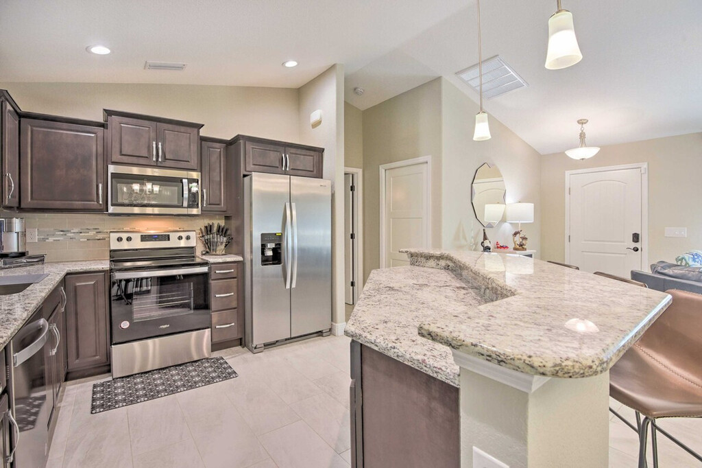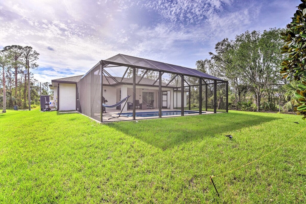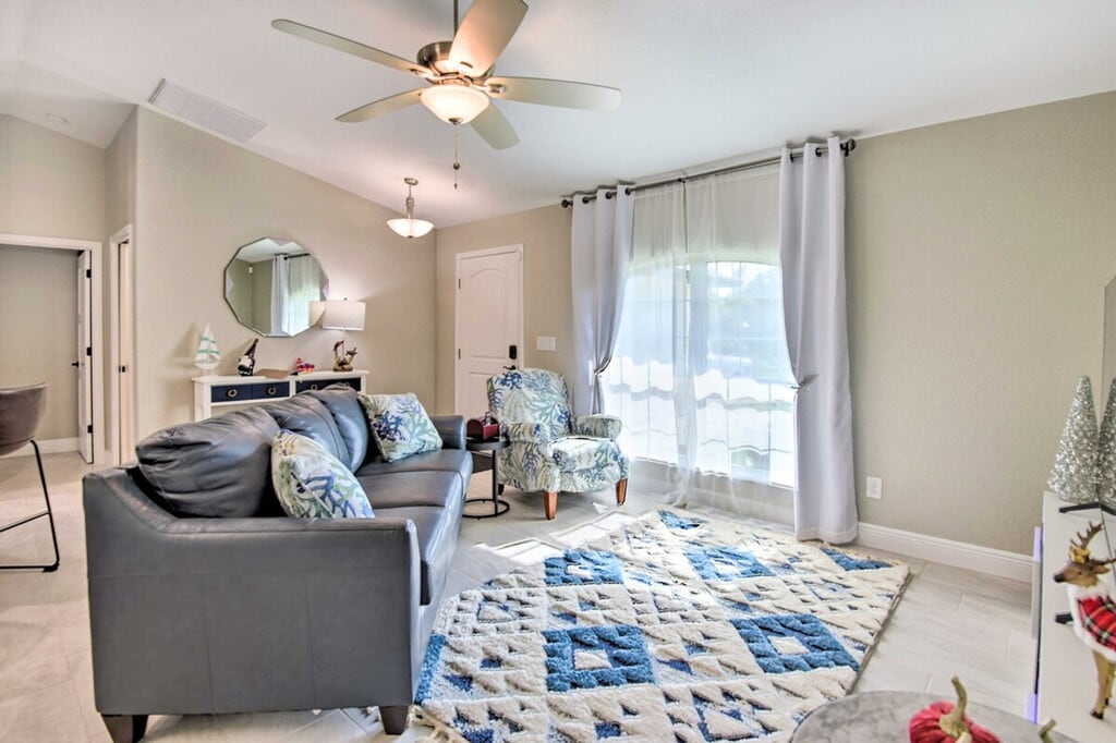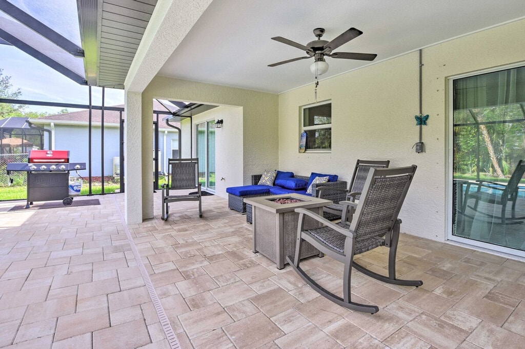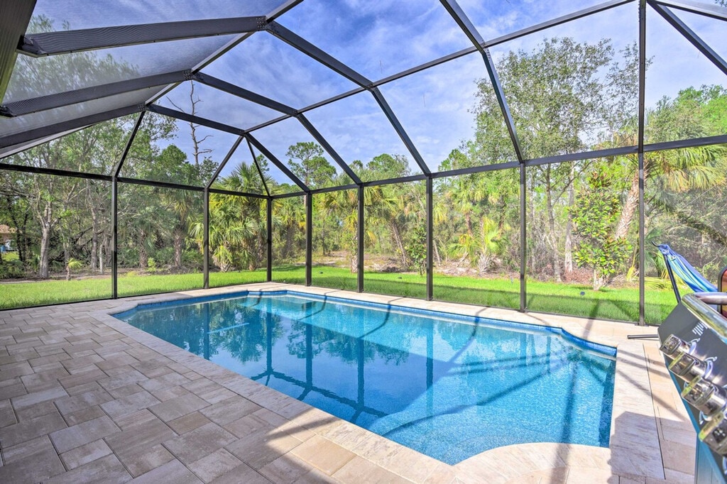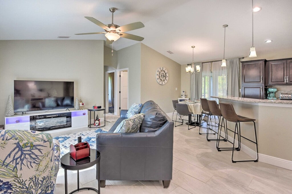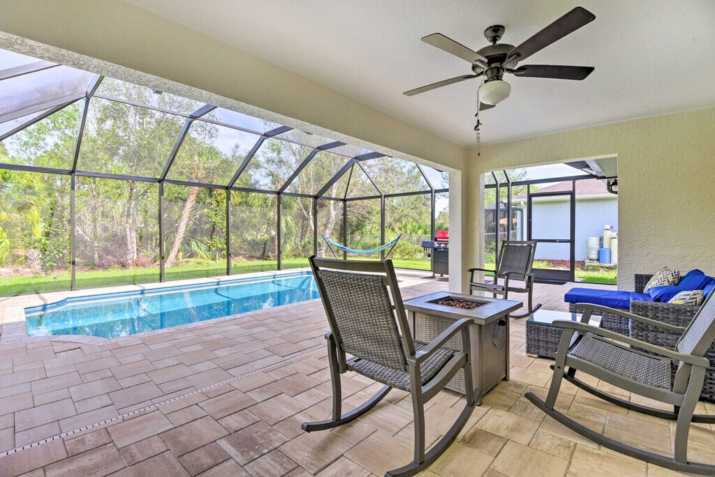 The advertised rate of $6,076/month is the lowest available price, based on a 30 day(s) stay with a move-in date of March 30, 2026. Rates vary depending on the duration of stay, season, and other parameters. For exact pricing and additional pricing components, please visit our website and enter your desired move-in and move-out dates. The rate is applicable when billed upfront; it can be higher if billed in multiple payments. Experience the best of the Sunshine State and feel at home in this welcoming 3-bedroom, 2-bath North Port vacation rental. Featuring a modern interior, a screened lanai, and a private pool, this home offers incredible spaces for you and your loved ones to spend quality time. The outdoor area includes a covered lounge area with a gas fire pit, a new gas grill, and pool toys. Inside, you'll find a smart TV with cable, an eclectic fireplace, a dining table, a breakfast bar, and an Alexa (Echo) with an Alexa speaker in the living room. The kitchen is fully equipped with a fridge, stove/oven, dishwasher, microwave, cooking basics, drip and Keurig coffee makers, toaster, kettle, water filter, dishware/flatware, paper towels, and trash bags. Additional amenities include complimentary toiletries, a hair dryer, an iron/board, keyless entry, free Wi-Fi, linens/towels, a washer/dryer, central air conditioning, and ceiling fans. There is an optional pool heat fee of $12/night, plus fees and taxes, applied to the entire stay. Venture out for a day of boating and fishing or head to Manasota Key to relax in the sand at Stump Pass Beach State Park. This centrally located home is 10 miles from Port Charlotte and 9 miles from Warm Mineral Springs. The garage is not available for guest use. The daybed is not suitable for adults, but there is an extra mattress with linens in the bedroom 1 closet. This property features 5 exterior security cameras that record video and audio when activated by motion. Must be at least 25 years old to book. Includes a laptop-friendly workspace. Guests will have access to the entire property via keyless entry. [SI]