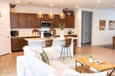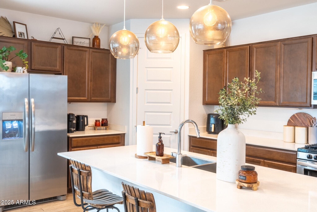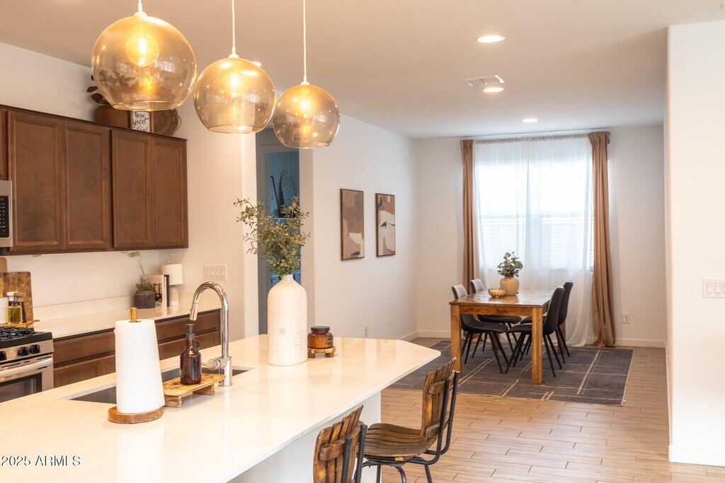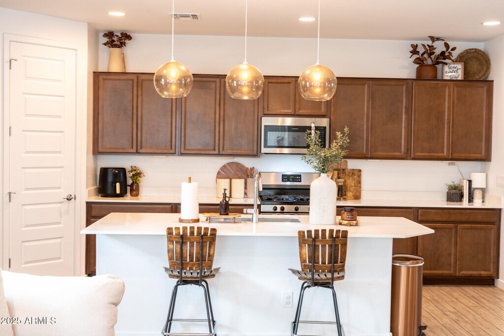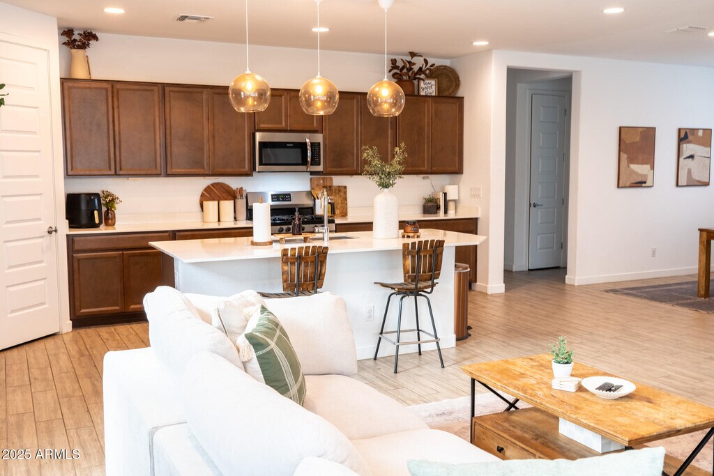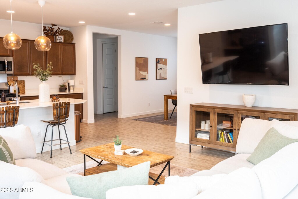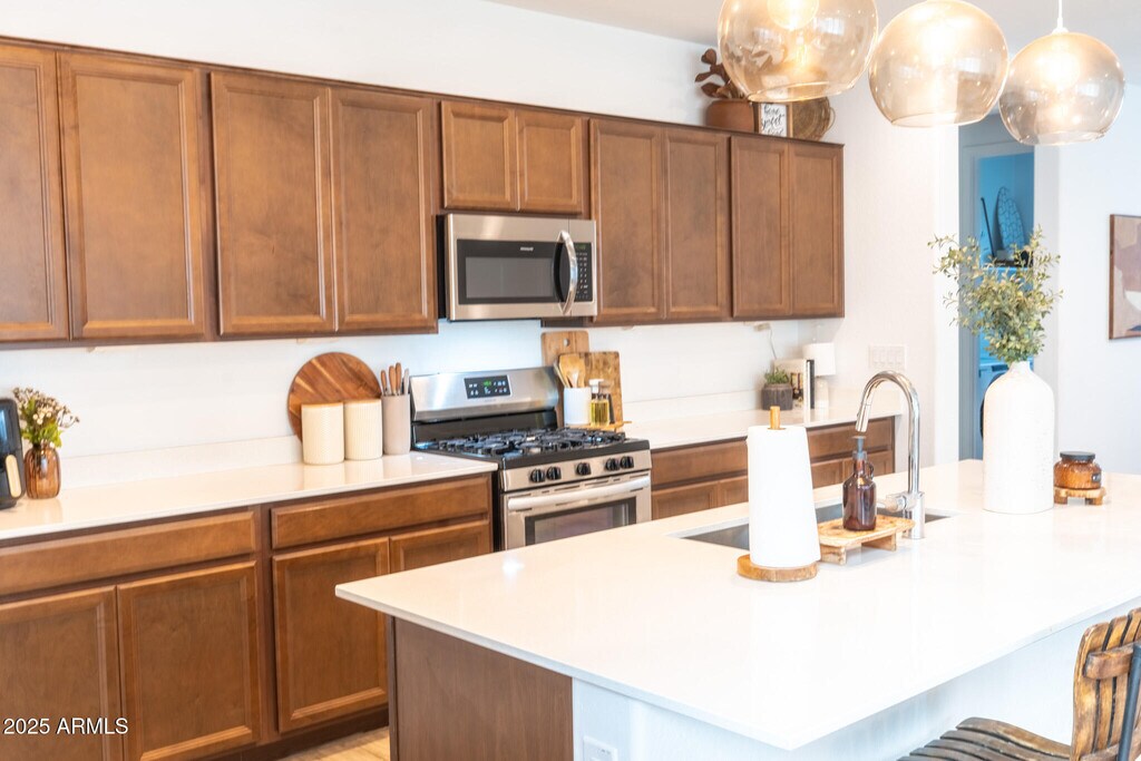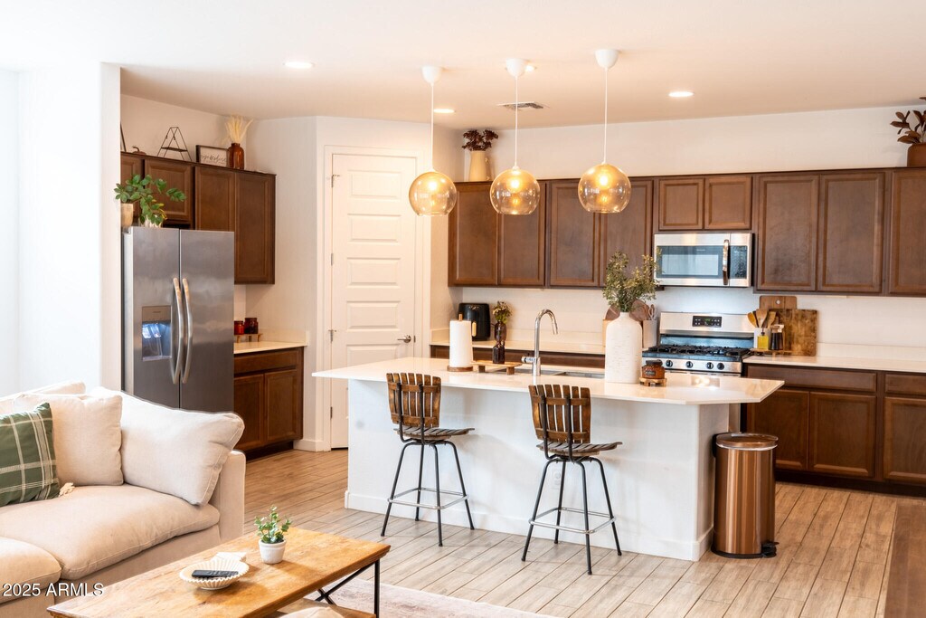Beautiful 4-bedroom,3-bath home with an open floor plan and modern finishes throughout. The kitchen features stainless steel appliances,rich wood cabinetry,and a large island with bar seating,flowing seamlessly into the bright living area. Spacious primary suite plus three versatile bedrooms perfect for family,guests,or a home office. Low-maintenance desert landscaping adds curb appeal,while the backyard is ready for your personal touch. Conveniently located near shopping,dining,and major freeways.