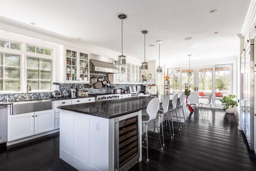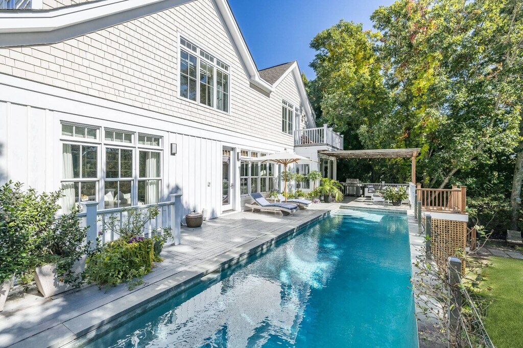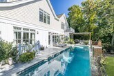 A stylish, gorgeous construction designed by award-winning architect James Merril. Set on an acre, this 5- 5-bedroom home has every desirable amenity. The primary bedroom has a terrace and a beautiful bathroom with a shower and a separate bathtub. The 4 guest rooms are all spacious and light-filled. Downstairs, there is an open living room and a den/ 5th bedroom with a full bath. An exquisite gourmet kitchen has all the bells and whistles, from a 6-burner Viking with a grill to a double Sub-Zero Fridge, wine fridge, double sinks, and dishwashers; it also has its own breakfast area. There is a formal dining area with a fireplace that is magnificent. The sunny Living Room shares the same dual-sided open fireplace. A lower-level gym. Many French doors open to the deck that has a gorgeous outdoor dining area- and a shaded lounge area with a 32' by 15' ft. heated pool. A path to the dock on the bay, which is a divine protected sanctuary, that accesses the big open bay. There is a lower basement level with a 2-car garage. The front of the house has a great veranda, all set on a quiet and charming high-end street in the Village of Sag Harbor. Rental Terms: June: $75,000 August - Labor Day: $225,000 July: $200,000 Memorial Day - Labor Day: $350,000 Other / Short Term - Year Round: $450,000