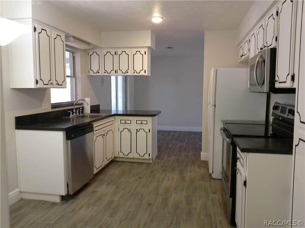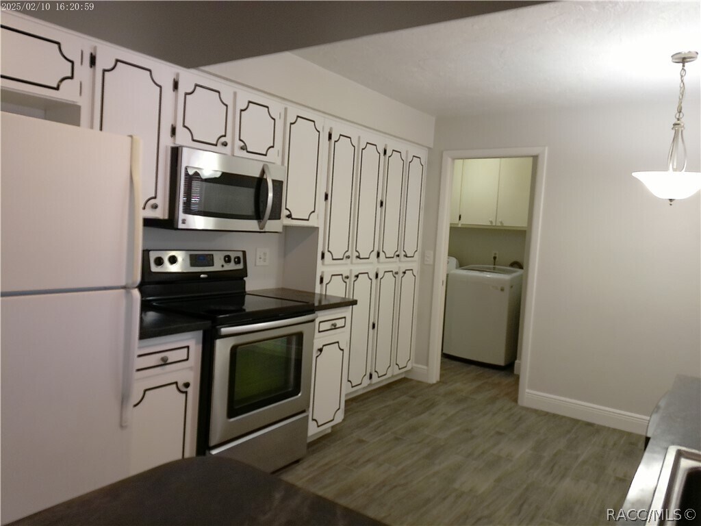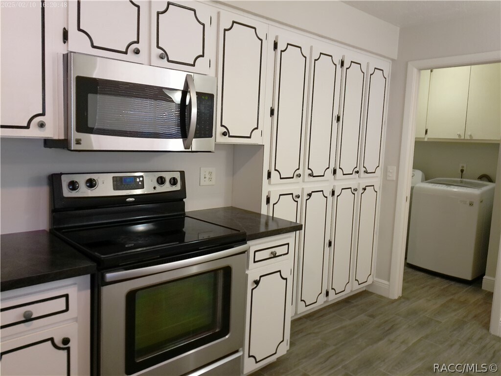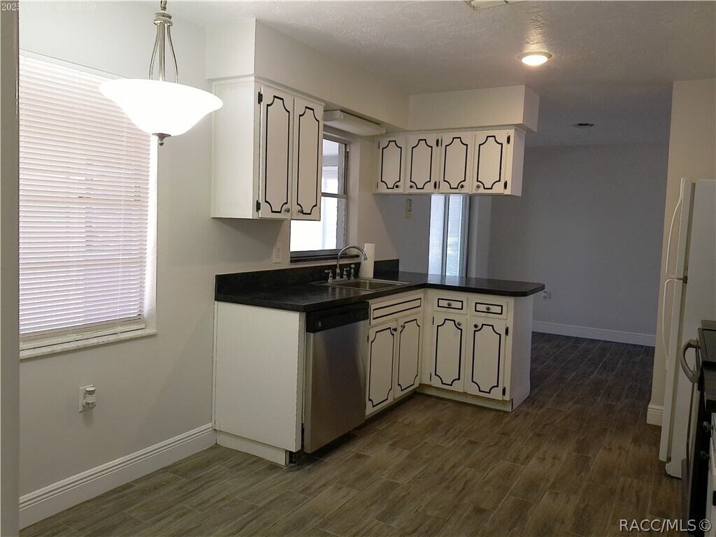 Beverly Hills - 2 Bedroom 2 Bath 1 Car Garage with Carport and Utility Storage. Open Floor Plan with Enclosed Porch Under House A/C and Screened Porch. Ceramic Plank Flooring. Spacious Kitchen with Abundant Cabinets. Inside Laundry with Washer & Dryer. Front Entry Courtyard. Large Landscaped Corner Lot with Mature Trees.