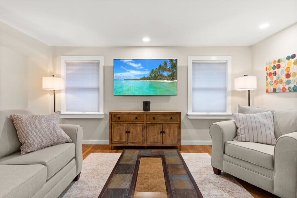Feel at home in this large 2,500 sqft Portsmouth home, an enjoyable walk or quick drive away from downtown's finest restaurants and shopping. This home features a fully equipped kitchen with upgraded appliances, a breakfast nook, and an 8-seater dining table. Enjoy the convenience of two in-unit washer and dryers, a BBQ grill, light workout equipment, and a three-season porch. For entertainment, there are large TVs in the living room and two of the bedrooms, allowing you to log into your streaming apps. The fenced-in side yard and backyard patio provide a safe and fun environment. A $100 fee per pet applies and will be charged through our software after the booking is confirmed. Located in one of the best neighborhoods in Portsmouth, this home is quiet, secluded, and residential. It's just an 8-minute drive from Portsmouth Hospital, 4 minutes from downtown Portsmouth, and 9 minutes from the beach. With easy access to I-95, it's a 20-minute walk to downtown Portsmouth, a short car ride to New Hampshire's seacoast beaches and coastal Maine attractions, and an hour's commute to Boston. Please be mindful of the neighbors during your stay and observe quiet hours between 9:00 PM and 9:00 AM. No more than 2 dogs are allowed. For guests bringing pets, please clean up after them, as additional payment will be requested for any extra clean up from your pet. Minut is a smart home device that measures volume levels throughout the property and allows us to respond to noise nuisances without disrupting your stay. Minut is 100% privacy compliant and is required on this property. There is also one outdoor security camera for your protection. You must be at least 25 years old to book. Includes an office desk, chair, printer, and paper shredder. Registration Number: 103518 [SI]