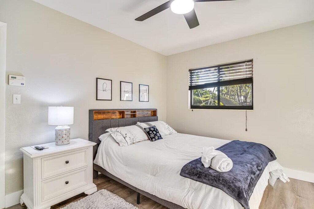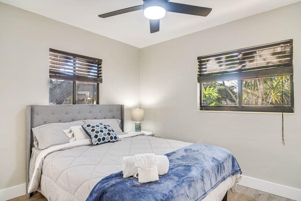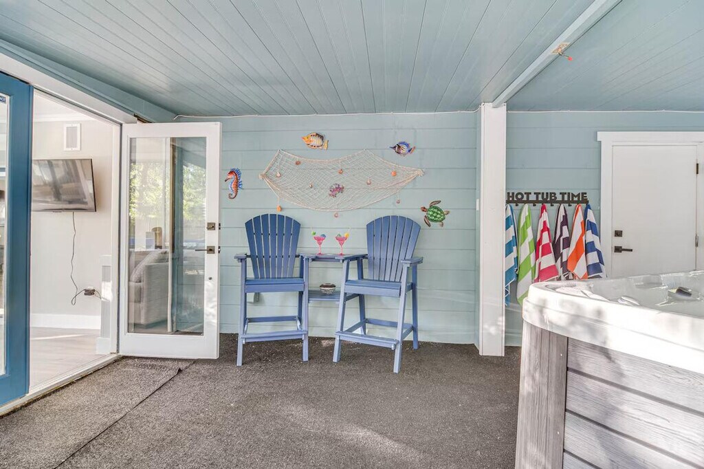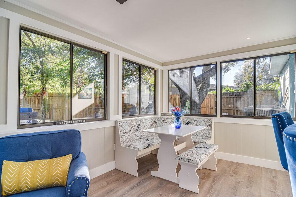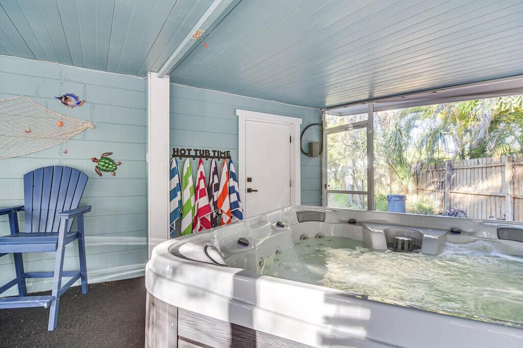 Feel at home in this modern 3-bedroom, 2-bath vacation rental in St. Petersburg. This single-story home requires one step to enter. This home features a sunroom, a large deck, a backyard, and a screened-in porch with a 7-person hot tub and outdoor seating. The kitchen is fully equipped with a dishwasher, refrigerator, stove/oven, microwave, drip coffee maker, Keurig coffee maker, starter coffee, toaster, cooking basics, dishware, flatware, trash bags, and paper towels. Other amenities include a smart TV, a dining table, bar-top seating, free Wi-Fi, towels, linens, a washer and dryer, central heating, A/C, beach chairs, and beach towels. Propane is provided for the gas grill. This home is close to beaches and everyday spots, including big-box stores, restaurants, and a gym. Walter Fuller Park is nearby for pickleball, and St. Pete Pier is a short distance away for fishing and relaxing by the water. Smoking, pets, events, parties, and large gatherings are not allowed. Guests must be at least 25 years old to book. Your safety matters; this property features two exterior security cameras. Camera 1 is on the front of the house facing the front outdoor entry, and camera 2 is on the back of the house facing the backyard. The cameras are outward facing and record video and sound when activated by motion. Early check-ins and late check-outs cannot be accommodated. [SI]