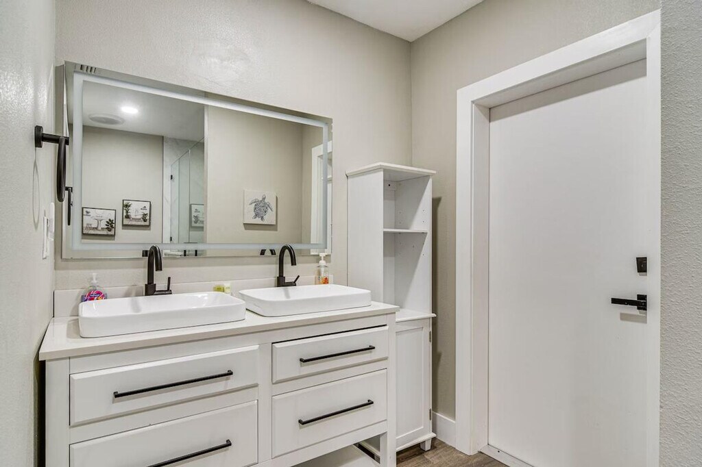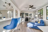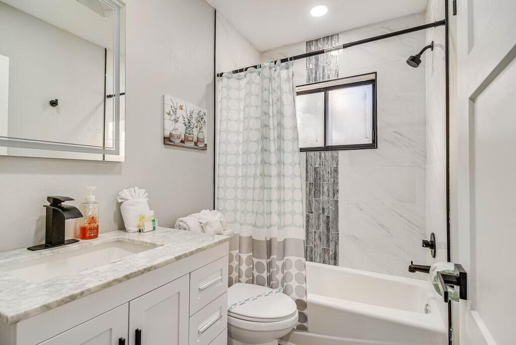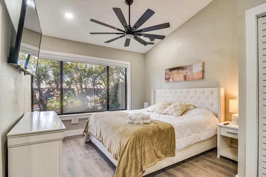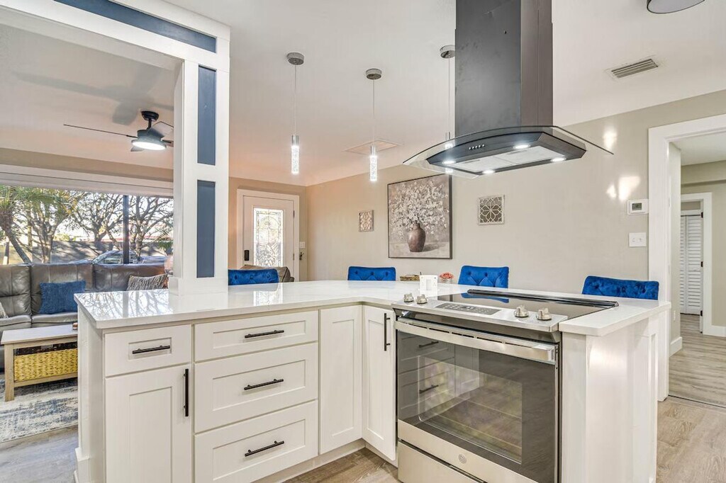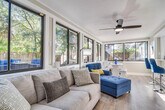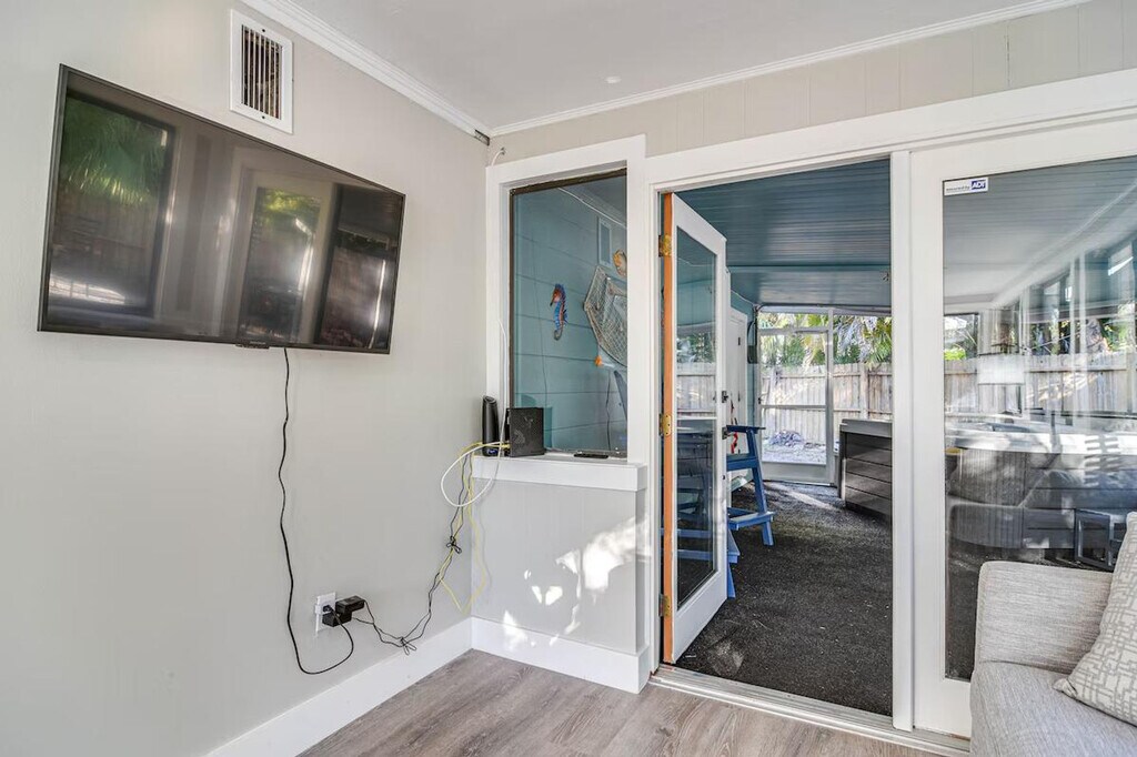 Feel at home in this modern 3-bedroom, 2-bath vacation rental in St. Petersburg. This single-story home requires one step to enter. This home features a sunroom, a large deck, a backyard, and a screened-in porch with a 7-person hot tub and outdoor seating. The kitchen is fully equipped with a dishwasher, refrigerator, stove/oven, microwave, drip coffee maker, Keurig coffee maker, starter coffee, toaster, cooking basics, dishware, flatware, trash bags, and paper towels. Other amenities include a smart TV, a dining table, bar-top seating, free Wi-Fi, towels, linens, a washer and dryer, central heating, A/C, beach chairs, and beach towels. Propane is provided for the gas grill. This home is close to beaches and everyday spots, including big-box stores, restaurants, and a gym. Walter Fuller Park is nearby for pickleball, and St. Pete Pier is a short distance away for fishing and relaxing by the water. Smoking, pets, events, parties, and large gatherings are not allowed. Guests must be at least 25 years old to book. Your safety matters; this property features two exterior security cameras. Camera 1 is on the front of the house facing the front outdoor entry, and camera 2 is on the back of the house facing the backyard. The cameras are outward facing and record video and sound when activated by motion. Early check-ins and late check-outs cannot be accommodated. [SI]