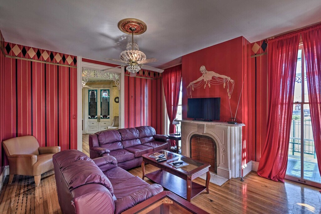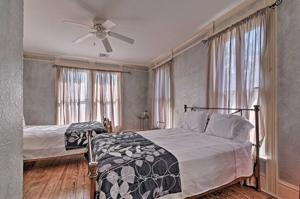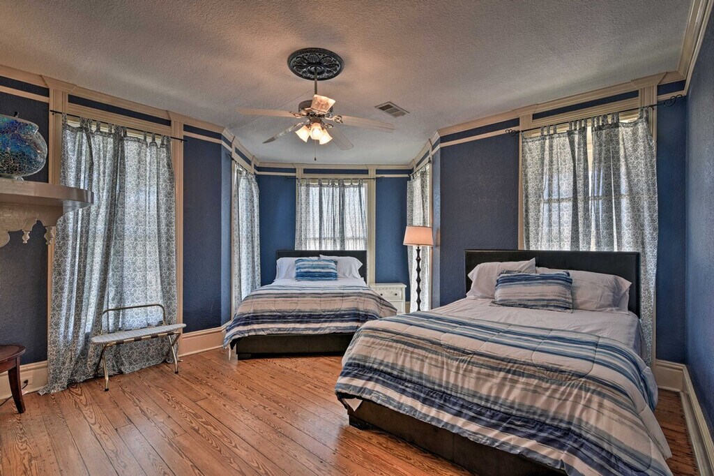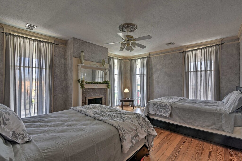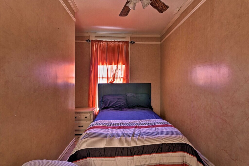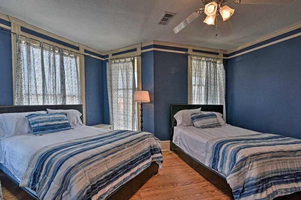 Feel at home in this Galveston vacation rental, aptly named 'Gingerbread House,' boasting old-fashioned Victorian charm, a wraparound deck, and hardwood floors. This spacious 3-bedroom, 1-bathroom home is centrally located on a corner lot. This fully outfitted home features flat-screen cable TVs, two living areas, a pool table, and a large dining room with five tables. The well-equipped kitchen includes two stoves/ovens, two drip coffee makers, a blender, and a beverage dispenser. Enjoy the convenience of free Wi-Fi, linens and towels, air conditioning, central heating, an enclosed yard, two porches, and charcoal and gas grills. Parking is available in the garage for two vehicles and in the driveway for four vehicles. Pets are welcome with a fee of $25. Located on Broadway, this home provides easy access to the rest of the island. Attractions including historic homes, Port of Galveston Cruise Terminal, Schlitterbahn, and Moody Gardens are never far away. The Galveston Island Historic Pleasure Pier and waterfront are just 1 mile away. No events, parties, or large gatherings are allowed. [SI]