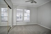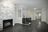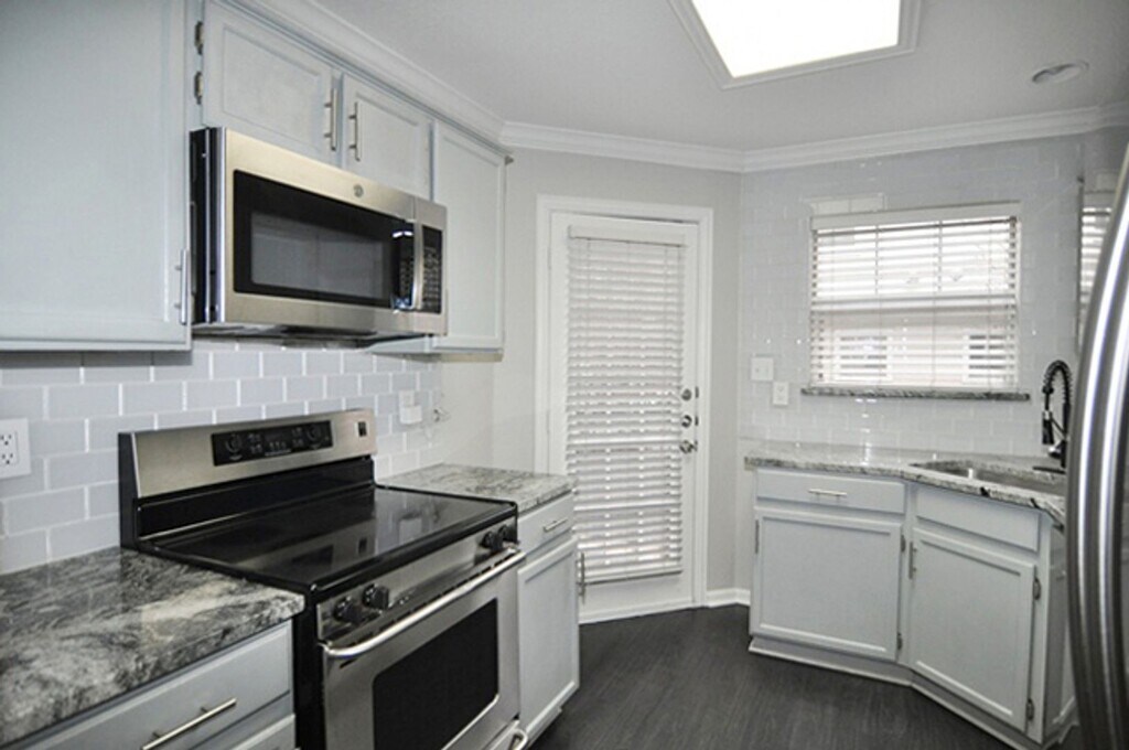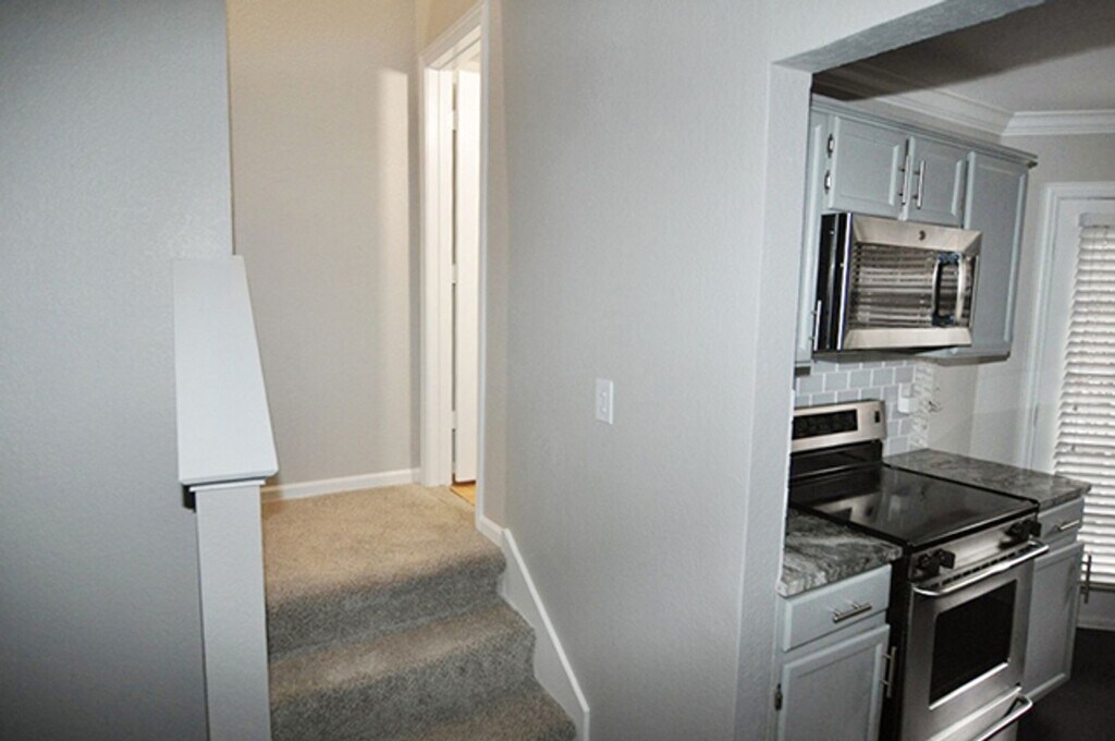 Stunning 2-bedroom, 2.5-bath, 1-car garage tri-level condo located in the sought-after Carriage House Condominiums of Dallas. This beautifully designed home features upscale finishes, elegant color palettes, and a prime location. The entry level offers convenient garage access, laundry facilities, and an additional storage room to meet all your organizational needs. The second floor showcases a gorgeous family room highlighted by a dramatic floor-to-ceiling stone fireplace, luxury vinyl plank flooring, and extensive crown molding—perfect for both relaxing and entertaining. The well-appointed kitchen features stainless steel appliances, granite countertops, a large pantry, classic subway tile backsplash, and upgraded fixtures. The third floor includes a stylish half bath with granite counters and a striking architectural window. Both upstairs bedrooms offer plush carpeting, crown molding, and private en-suite bathrooms, one of which is enhanced with elegant wainscoting details. Step outside to enjoy your private stone balcony—ideal for entertaining or savoring your morning coffee. Welcome home. No smoking permitted. For qualification requirements and to schedule a viewing, please visit