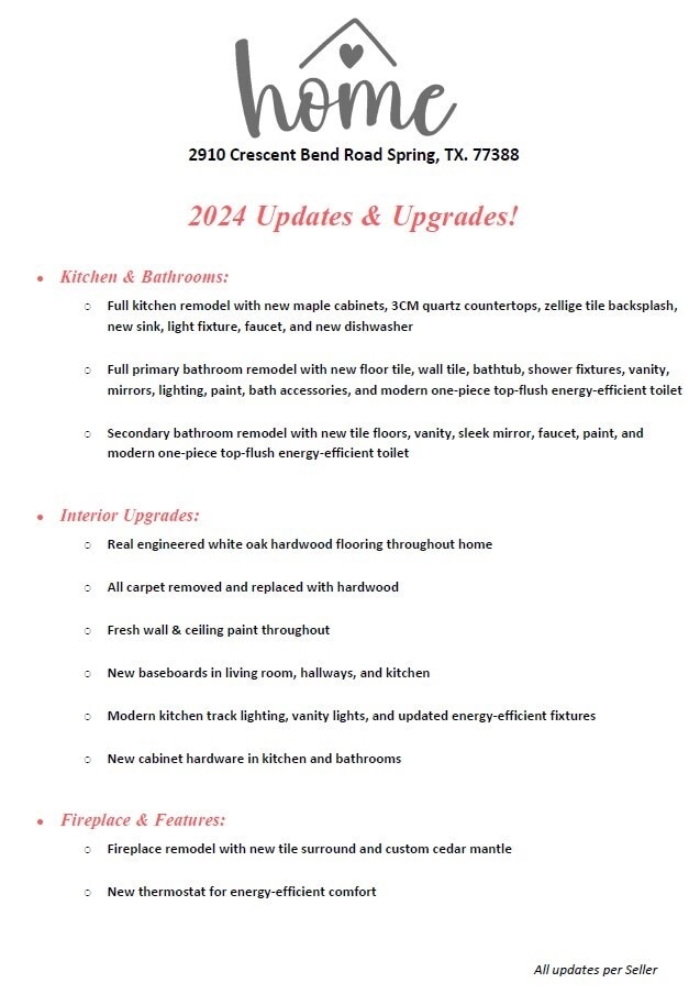 Your private hideaway in a quiet,gated community. With only 57 homes,you’ll enjoy the serenity of your own space - no more shared walls with noisy neighbors. You will have full-size appliances,a private backyard,and thoughtful upgrades rarely found in rentals. The remodeled kitchen shines with quartz countertops,stainless steel appliances,and new cabinetry. Hardwood floors,high ceilings,tons of windows,and a beautifully updated fireplace create a warm,open feel. The primary suite includes room for a desk or reading nook,while the spa-inspired bathroom offers a soaking tub and elegant stone counters. Tucked just off Cypresswood Drive,you’re close to shopping,dining,and conveniences—but still surrounded by peace and quiet. No mowing,no stress—just home. MLS# 25106904