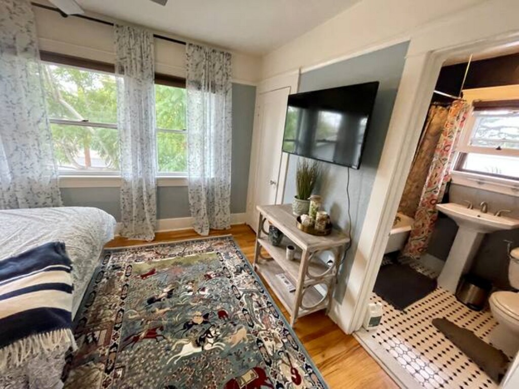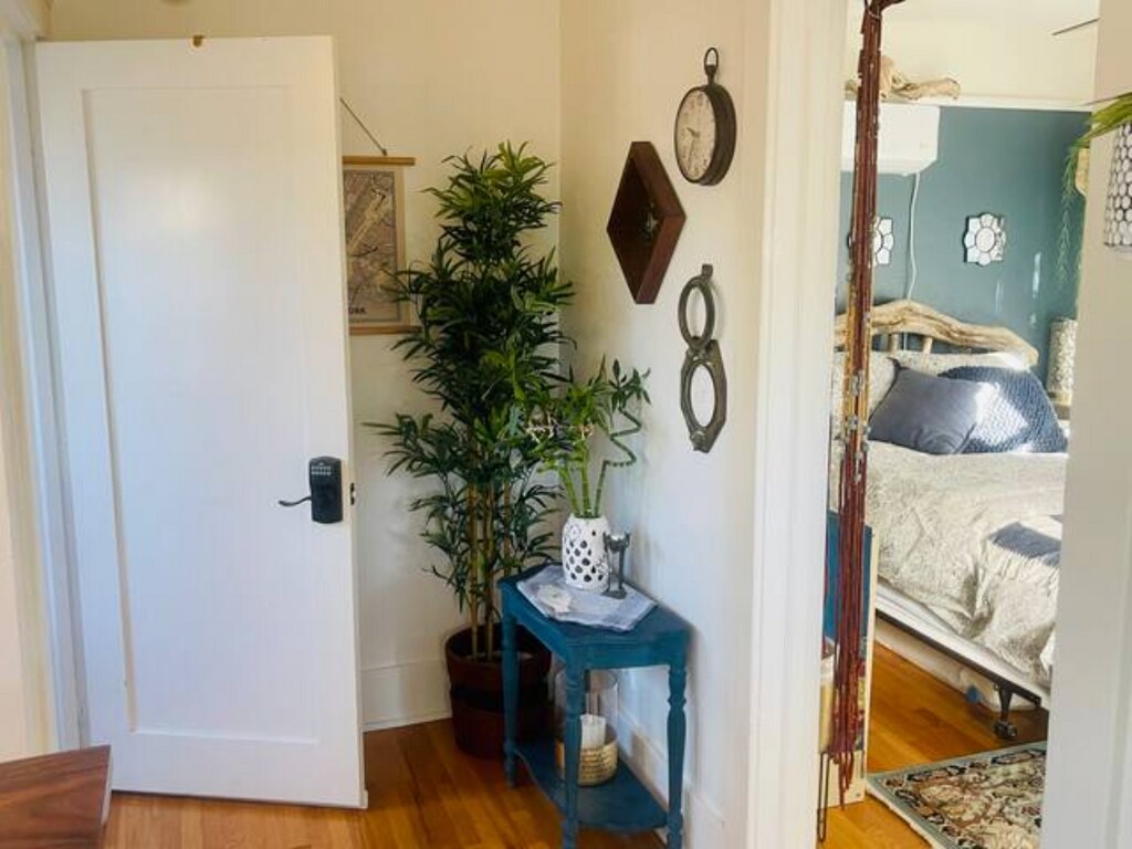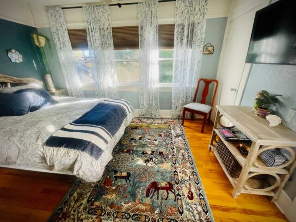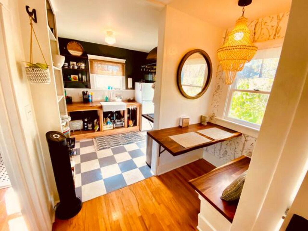 South Park: 2 story Detached Carriage House upper and lower unit Our 2BR/2BA Carriage House is nestled in the heart of South Park, walking distance to fabulous restaurants, shops, art studios, and so much more. South Park is one of San Diego's most sought-after neighborhoods, kind of a local's secret. This fully renovated, historic building is just a block away from Balboa Park and the best off-leash dog park in the city. The Carriage House is fully detached from the main house, and includes a private entrance and courtyard with patio furniture. The upstairs is a 1br/1ba with a full kitchen and the downstairs is a studio. We are renting both units as a whole. This is the original Carriage House to the main house. The main house has been featured in local and architectural magazines and has also been one of the featured tour houses on the “South Park Historic District Walking Tour.” It is highlighted for its unique, eclectic architectural design. Please inquire about articles of the home if you're interested. Most San Diegans will tell you that South Park is their dream neighborhood, and the Carriage House is situated in the heart of it all. Regardless of which direction you head, you will find something to enjoy within walking distance in just minutes. Balboa Park is just one block west of the property and Juniper square is just one block north, where bakeries, bistros, art studios, boutique shops, and quality dining can be enjoyed just an easy stroll away. The Carriage House is technically a granny flat/backhouse, yet it can be accessed directly from the street (no walking through to the back yard). Offering exceptional privacy, it has a private entrance, a private patio, and even boasts its own address. The private patio offers inviting features for hanging out outside. You can barbecue and enjoy outdoor dining on comfortable chairs and tables. String lights that come on at dusk will enchant you well into the evening. From this second story unit, the view from every window is breathtaking. You'll see gorgeous Jacaranda trees from the bedroom windows, and an intimate garden area from the kitchen window.