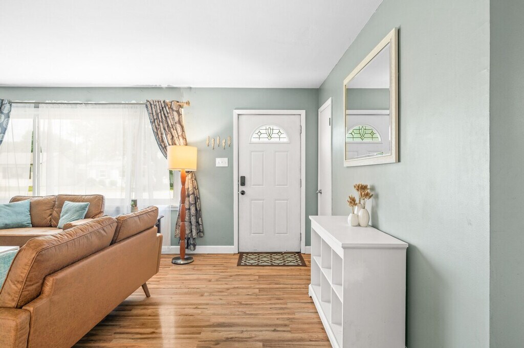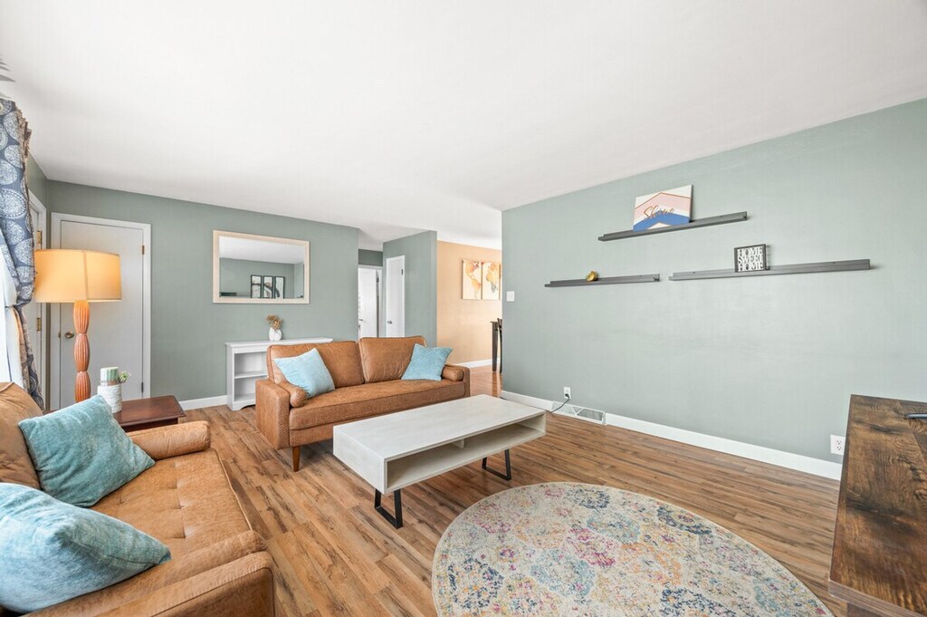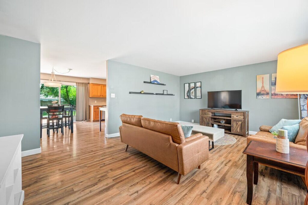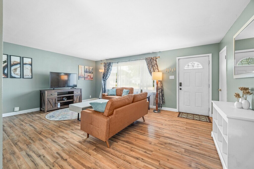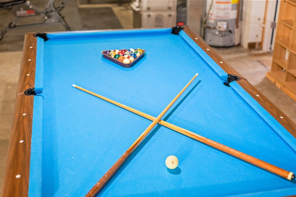 Feel at home in this cozy single-level home with a fully equipped entertainment basement. This charming single-level home features a welcoming living room and dining area, along with a modern kitchen that opens directly to the backyard. The basement is a haven for relaxation and entertainment, featuring a private bar, a movie projector, cozy couches for gatherings, a pool table, and a variety of games. There is a fee of $250 for losing the garage door opener. The code to enter the property will be provided before checking in. [SI]