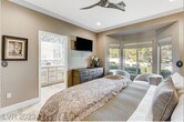 SHORT-TERM RENTAL- 55+ Community (fully furnished) - This charming Sun City Summerlin home features a complete designer-led renovation with premium upgrades throughout. You enter through a delightful courtyard set up for outdoor dining, and enter the open-plan living space, where the Restoration Hardware furnishings welcome you to your luxurious stay. Living room features a 75-inch state-of-the art smart TV, both bedrooms also have smart TV's, all with internet connections to stream your favorite shows. Primary bedroom features a comfortable King size bed. Alexa speakers throughout the home and the high speed internet allows you to work and to play. This home is fully outfitted and includes all the kitchen essentials and so much more. Just minutes away is the renowned Highland Falls golf course, one of three courses within Sun City. Internet & Wifi are included. Sun City Summerlin is a 55+, age-restricted. Pet Friendly. ***CALL/Text LISTING AGENT BEFORE APPLYING. *Only Available: JUNE & JULY / DEC, JAN & FEB.