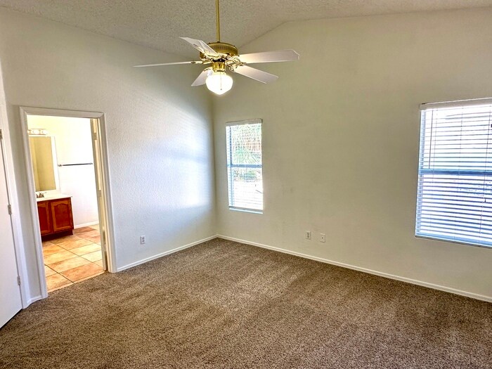 LOCATED IN THE HEART OF MOUNTAIN PARK RANCH. Fantastic home in ''Mirage'' with open great room floor plan and split bedrooms. New AC. Stainless appliances in open kitchen. Two tone paint with 18'' Tile throughout except bedrooms which have new carpet. Great room has vaulted ceiling and wood burning fireplace. Master suite has double vanities, walk-in shower, walk-in closet and glass block window. Brushed nickel bathroom plumbing fixtures. Separate exit to 6 X 15 covered patio. 3rd bedroom used as office w/o closet. Just one block from Vista Canyon Park. Walk to all (3) schools Estrella, Akimel,& Desert Vista and Vista Canyon Park. Pets on approval. Vacant on lockbox on the front door. Email agent for status. $40 credit/person over 18. Pets on approval. $200 initial admin fee, 2% per month monthly admin fee. Apply & pay for credit at www.rch- click ''tenant services'' then ''apply now ' This property allows self guided viewing without an appointment. Contact for details.