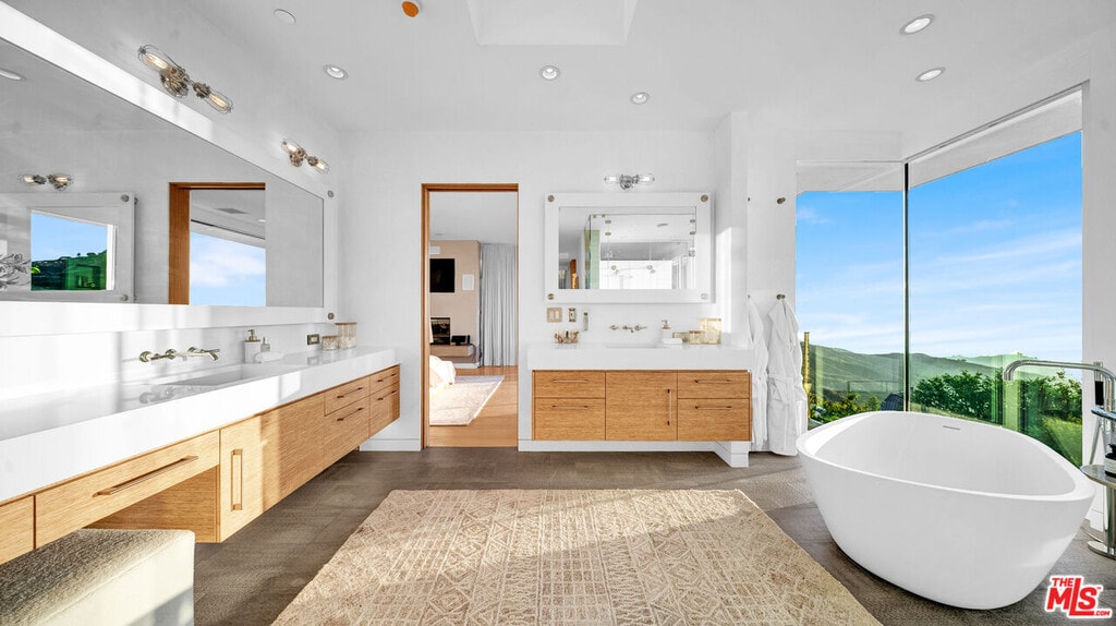 Perched above the Malibu coastline and framed by 2.4 acres of unspoiled landscape, this modern architectural estate captures the rare intersection of privacy, design, and commanding ocean views. Gated and secluded, the residence looks out across the Pacific, rolling canyon hills, and dramatic sunsets that define the Topanga lifestyle.Steel, glass, and concrete are balanced with warm natural finishes throughout, creating a home that feels both refined and grounded. Walls of glass dissolve the boundary between indoors and out, drawing in light, ocean air, and uninterrupted coastal scenery from nearly every room.A tranquil water feature marks the arrival experience, setting the tone for a home designed around calm, openness, and flow. The main living spaces unfold effortlessly across expansive patios, ideal for both entertaining and quiet retreat. The living room anchors the home with one of three fireplaces and connects seamlessly to the dining area and chef's kitchen.The kitchen is purpose-built for serious use and elevated entertaining, featuring Wolf and Sub-Zero appliances, double ovens, multiple sinks, and dual Viking dishwashers. Every element is positioned for function, scale, and connection to the surrounding views.The ocean-facing primary suite is a true sanctuary, wrapped in floor-to-ceiling glass and complemented by a spa-style bath with steam shower and a private balcony overlooking the coastline. Two additional guest suites occupy the main level. The lower level offers a media lounge with wet bar and a fourth en-suite bedroom, ideal for a gym, studio, or private office.The home is equipped with solar power, backup energy systems, whole-home water filtration, and an upgraded Savant automation platform controlling lighting, climate, sound, and shades. A newly installed camera system enhances security, and an electric vehicle charger supports modern living.For pet enthusiasts, a custom-built architectural catio integrates seamlessly into the home, offering a rare, design-forward outdoor environment.With parking for up to ten vehicles, proximity to premier hiking and biking trails, and a direct, scenic route to the beach below, this estate offers scale and seclusion without isolation.This is Topanga living at its most elevated. Private. Architectural. Immersed in nature. Defined by view, light, and air. Also available for sale. MLS# 26639615
