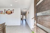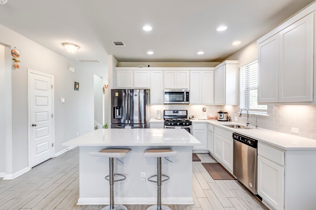 Beautiful 2-Story Home with Upgrades & Prime AmenitiesThis stunning 2-story Navidad plan, Elevation C home offers 3 bedrooms, 2.5 bathrooms, and a 2-bay detached alley-load garage. The primary suite is conveniently located on the first floor, along with a flex room, separate dining area, living room, kitchen, and a half bath. Upstairs features 2 bedrooms, a full bath, a spacious game room, and a balcony.The kitchen is equipped with 42" painted white cabinets, gray subway tile backsplash, white quartz countertops, gas stove, oven, microwave, and vessel washer, plus under-cabinet lighting and USB ports. Other upgrades include a covered back patio, mahogany front door, additional recessed lighting in the great room and primary suite, 2nd sink in primary bath, ceiling fans in living areas, and 2" faux wood blinds throughout. Premium tile flooring flows through the main living spaces, and the home includes a water softener and RO system.Enjoy community amenities including a swimming pool, clubhouse, fully equipped gym, kids play area, and walking trails. Middle and high schools are within walking distance, making this home perfect for families seeking convenience and comfort.