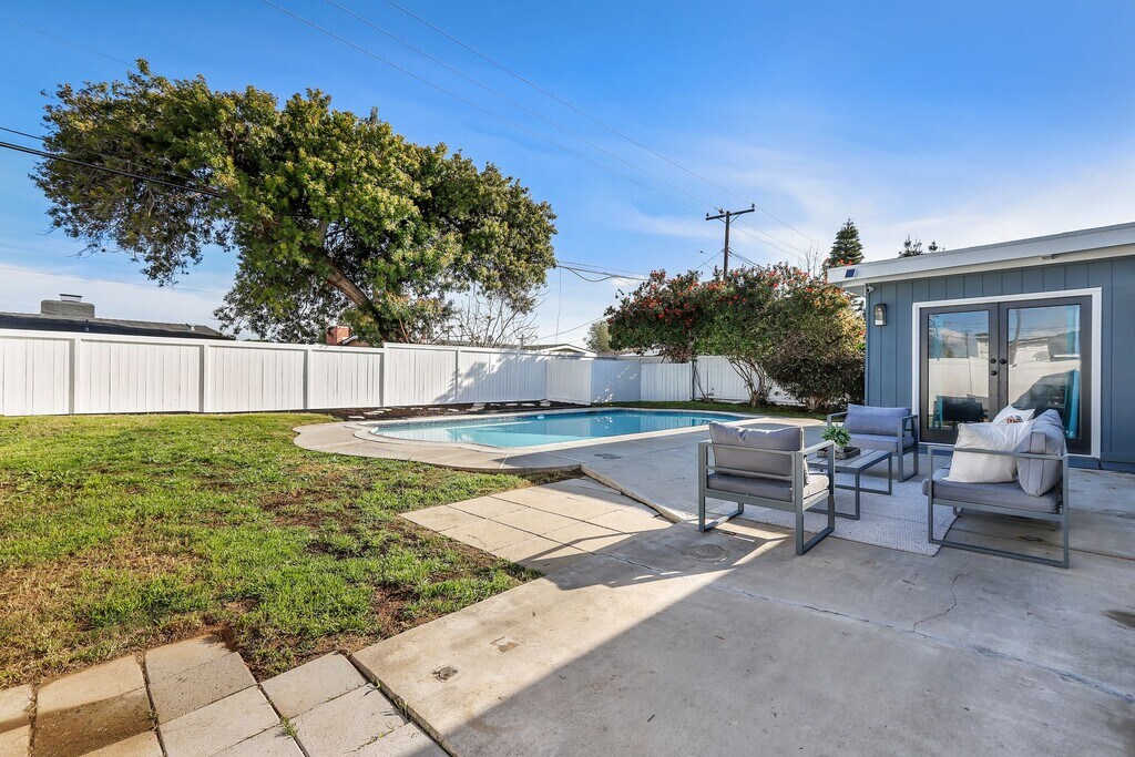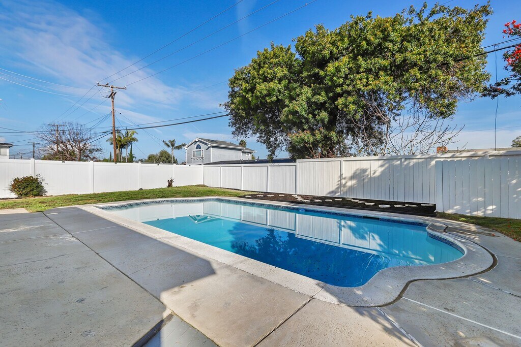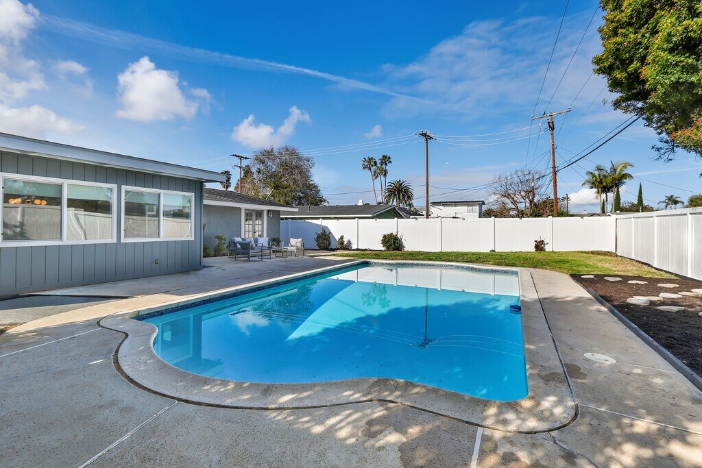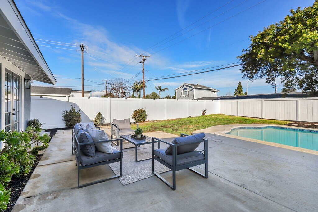 Welcome to your dream home! This stunning mid-century modern gem offers the perfect blend of style, comfort, and luxury. Situated in the desirable College Park neighborhood of Costa Mesa, this single-family residence boasts 3 bedrooms, 2 bathrooms, and a host of desirable amenities. As you step inside, you're greeted by the elegance of luxury vinyl flooring that runs seamlessly throughout the home. The spacious layout includes separate living and family rooms, offering ample space for relaxation and entertainment. The heart of the home is the completely updated kitchen, featuring sleek quartz countertops and top-of-the-line stainless steel appliances. Whether you're a culinary enthusiast or simply enjoy the convenience of modern amenities, this kitchen is sure to impress. The primary bedroom offers an en-suite bathroom, french doors leading to the backyard and patio area. Two additional bedrooms provide flexibility for kids, guests, a home office, or whatever your lifestyle demands. Step outside to your own private paradise, where a spacious backyard awaits. Lounge by the pool on warm summer days, host gatherings with friends and family, or simply soak in the serenity of your surroundings. Convenience is key with an attached 2-car garage, providing secure parking and additional storage space. Plus, with easy access to local amenities, schools, and parks, this home offers the perfect balance of comfort and convenience. Don't miss out on the opportunity. For a personal tour call D.E. Properties at .