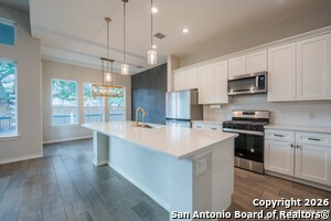 **MUST SEE VIRTUAL TOUR** AVAILABLE NOW in the gated Elkhorn Ridge Neighborhood! This 2022 single-story, 4-bedroom, 2.5-bath home features a bright open-concept layout, high ceilings with recessed lighting, and large windows that bring in abundant natural light. The living room is anchored by a stone masonry gas fireplace. The modern kitchen offers gas cooking, a quartz island, tall cabinetry, ample counter space, and a walk-in pantry. Enjoy a desirable split-bedroom floorplan with the primary suite separated from the three secondary bedrooms. The primary bath includes double vanities, separate shower, modern soaking tub, private water closet, and walk-in closet. Outside, relax on the covered patio and newly built wood deck overlooking a fenced backyard with mature trees and a wood privacy fence. Additional features include owned solar panels for significant energy savings and an owned water softener. Conveniently located approx. 1 mile to the new H-E-B at Lemon Creek Ranch and approx. 0.8 miles to I-10 for easy access to Boerne and San Antonio destinations like The Rim, La Cantera, and Six Flags Fiesta Texas. Pets considered with owner screening. Apply today and make this home yours.