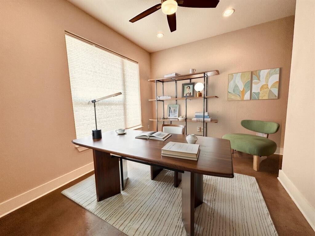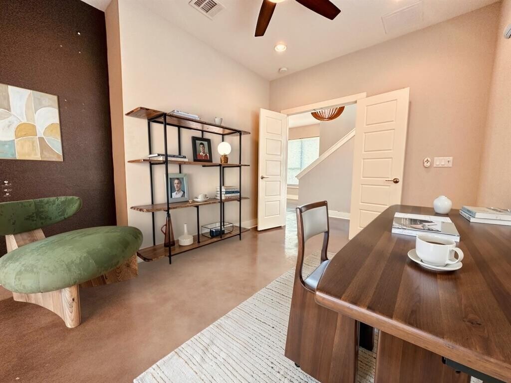 VALUE PRICED and UP TO 2 APPLICATION FEES REFUNDED WITH APPROVED APPLICATIONS!!! Elegant comfort in this 2 bed, 2.5 bath unit in the gated Edgewick development. Open floor plan downstairs has modern light fixtures, stained concrete floors, high ceilings and lots of natural light. Kitchen with granite counters, center island, stainless appliances and large pantry. Dedicated office/bonus room, half bathroom and extra storage under stairs. 2nd level has 2 bedrooms - both with ensuite baths. Primary bedroom is expansive. Bathroom has duel vanities, walk-in shower and large closet. 2nd bedroom also with lots of space. Private bath with shower/tub combo and plenty of storage. Laundry closet upstairs with stacked washer/dryer included. Home also features detached single-car garage with easy access to kitchen entrance and fully fenced, private yard. Edgewick community has wonderful pool/green space with large shade trees and areas for grilling. Central location between E Oltorf and i35 gives you quick access to anywhere in town. Ready for immediate move-in, with 9 or 21 month lease terms available. Come see!