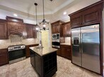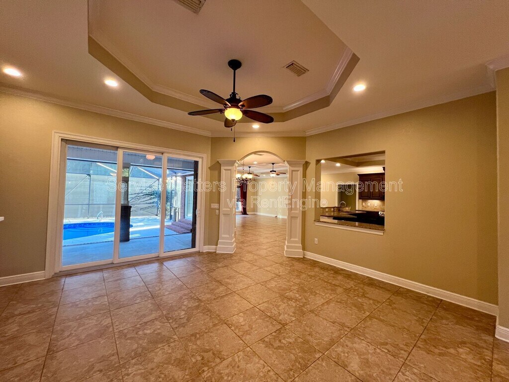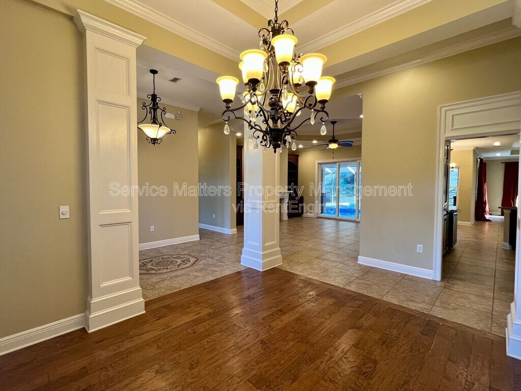 Located in the beautiful Stonebrook subdivision, this 5 bedroom home is the definition of class and style. Though located within a golf course subdivision, you'll find this home tucked away in a private alcove with a beautiful green belt across the back of the property that includes access to a peaceful brook. Other features you'll note walking the grounds include the 3 car garage, a screened in pool with adjoining hot tub, a large, covered patio area, and a fire pit and grill located at the back of the property near the stream. And all of this is nestled into a beautifully landscaped lawn. Inside you'll discover a number of design choices that make this home both unique and exquisite starting with the tile work at the front entrance. Crown molding and detailed baseboards run throughout the home, pairing nicely with the many stylish light fixtures. The home features a formal living room with fire place, and for a more casual setting, enjoy the morning room which opens to a casual dining spot and the kitchen. You'll love all the counter and cabinet space afforded in the kitchen, including a large, walk-in pantry. Granite counters, beautiful cabinets, and a suite of stainless appliances finish this space. A formal dining room at the front of the home is perfect for holiday gatherings and special occasions. Additional features include an office with built-ins, a pool bath that also works as a guest bathroom, and a guest suite. The owner's bedroom is located on its own wing and provides a private access to the back patio and pool. This room easily accommodates the most robust of bedrooms sets. And the adjoining bathroom includes two spacious walk-in closets, dual vanities, a garden tub, and walk-in shower. On the opposite side of the home, you'll discover the guest rooms, each with ample closet space too, sharing a jack-and-jill style bathroom. The fifth bedroom is located above the garage and easily converts into a media or game room. An endless number of features make this home ideal for those seeking a different level of rental experience. Check it out soon. By submitting your information on this page you consent to being contacted by the Property Manager and RentEngine via SMS, phone, or email.