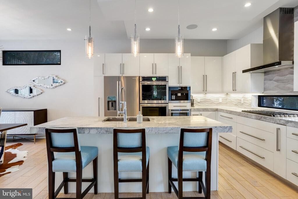 Discover this one-of-a-kind Furnished Luxury Rental home! Boasting approximately 4,200 square feet on 3 levels, this property offers unparalleled living experience for the most discerning clients seeking an upscale residence. Located in the Kent/Palisades area, one of Washington DC's most prestigious neighborhoods, this contemporary masterpiece stands as a testament to modern luxury. Experience the seamless blend of open concept living spaces bathed in natural light, offering breathtaking vistas of the verdant, terraced landscape. Every corner of this modern sanctuary is adorned with exquisite designer finishes, placing you within a few minutes from the city's most coveted attractions and just half a mile from Georgetown. Upon entering, you're greeted by over 1,400 square feet of uninterrupted living space, accentuated by expansive floor-to-ceiling windows that frame both the front and rear of the home, overlooking a stunning two-tiered stone patio. Step into an elegant living room enhanced by a dramatic gas fireplace, exquisite Italian designer furniture, creating the perfect atmosphere for formal entertaining or casual living. Beyond the living room lies the sitting parlor, a serene space that overlooks the enchanting two-tiered back patio. The floor-to-ceiling folding doors provide a seamless transition to the outdoors. The chef's kitchen, seamlessly integrated with the dining area, boasts elegant grey marble countertops and premium appliances, including a six-burner gas cooktop, double wall ovens, an integrated espresso machine, and wine storage. Ascend to the second level, where the large primary suite captivates with double-height ceilings, a cozy gas fireplace, a spacious walk-in closet, and a sumptuous ensuite bath. Three additional bedrooms complete this level, with one offering its own ensuite bath and two sharing a hall bath. A conveniently located laundry room is also found here. The lower level presents a perfect retreat for an au pair or visiting family and friends, featuring its own private entrance, a kitchenette, separate laundry, a full bath, and flexible spaces that can accommodate a bedroom and living room, along with ample closet space. Throughout the home, luxurious elements abound, from the custom wallpaper by designer Philip Jeffries to the wide-plank oak hardwood floors. The smart home system, featuring electronic shades, lights, a doorbell, and an alarm system, ensures modern convenience at your fingertips. The backyard oasis features a sprawling 700+ square foot stone patio, fully equipped with electrical service, a gas grilling station and a fire pit. An oversized one-car garage with an EV charging station and a driveway that can fit two additional vehicles complete this home.