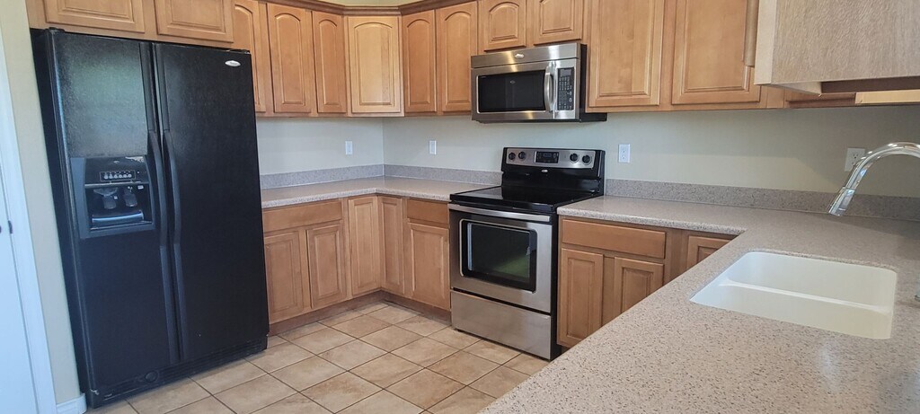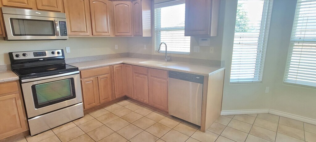 This newer home in College Park features tall ceilings, large kitchen with all appliances opens to the rear yard covered patio, 3 large bedrooms, 2 baths, upgrade kitchen, double garage with electric opener, sprinkler system, covered patio, double garage with electric opener, total electric home with central heat and cooling. 1 dog allowed! Can do month to month or 6 months lease.
