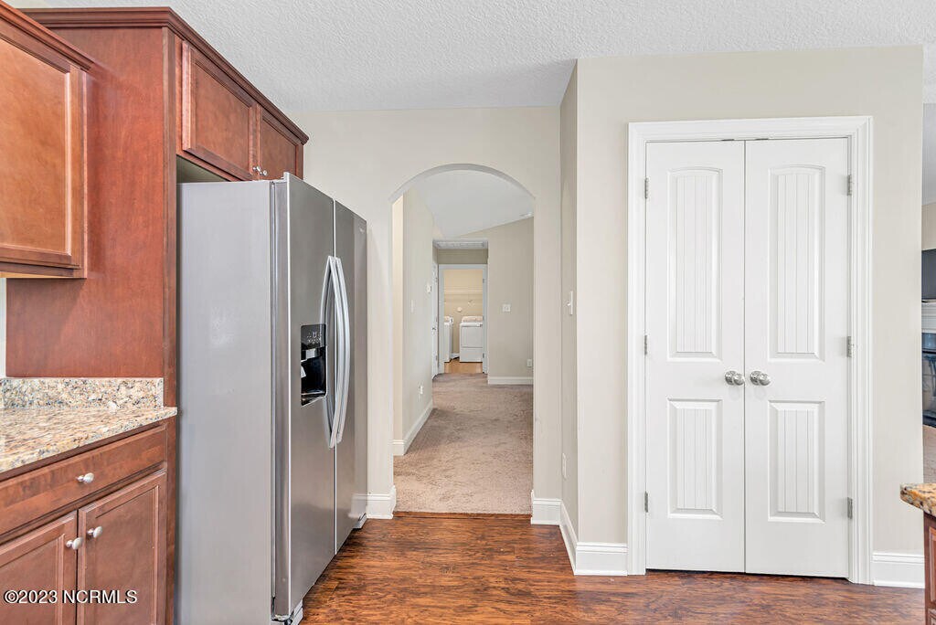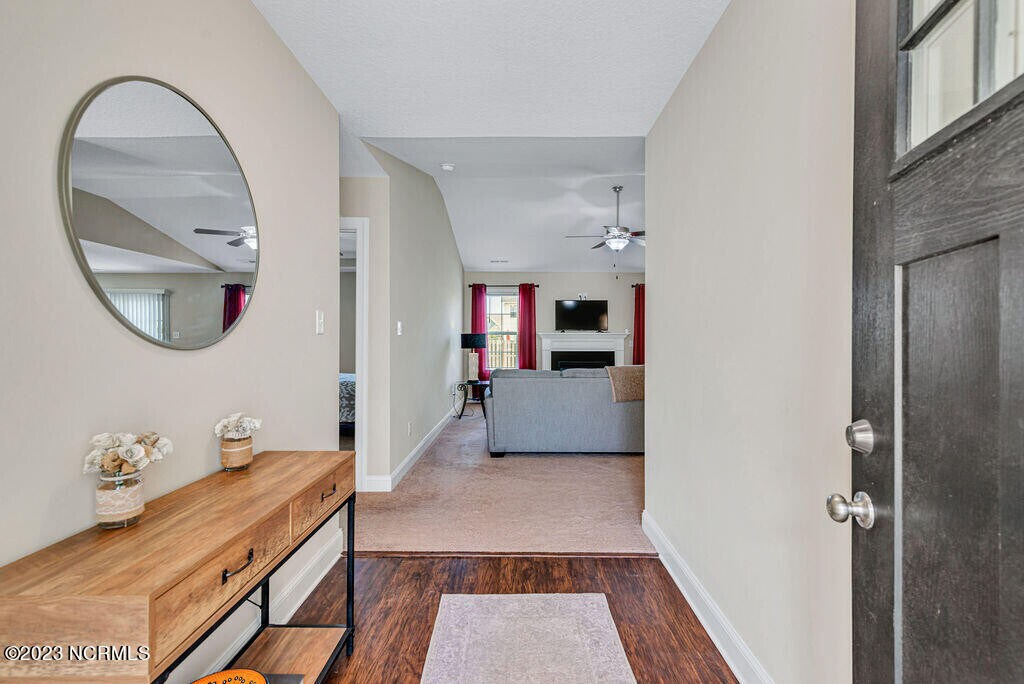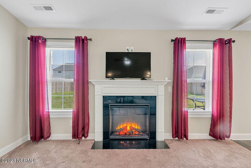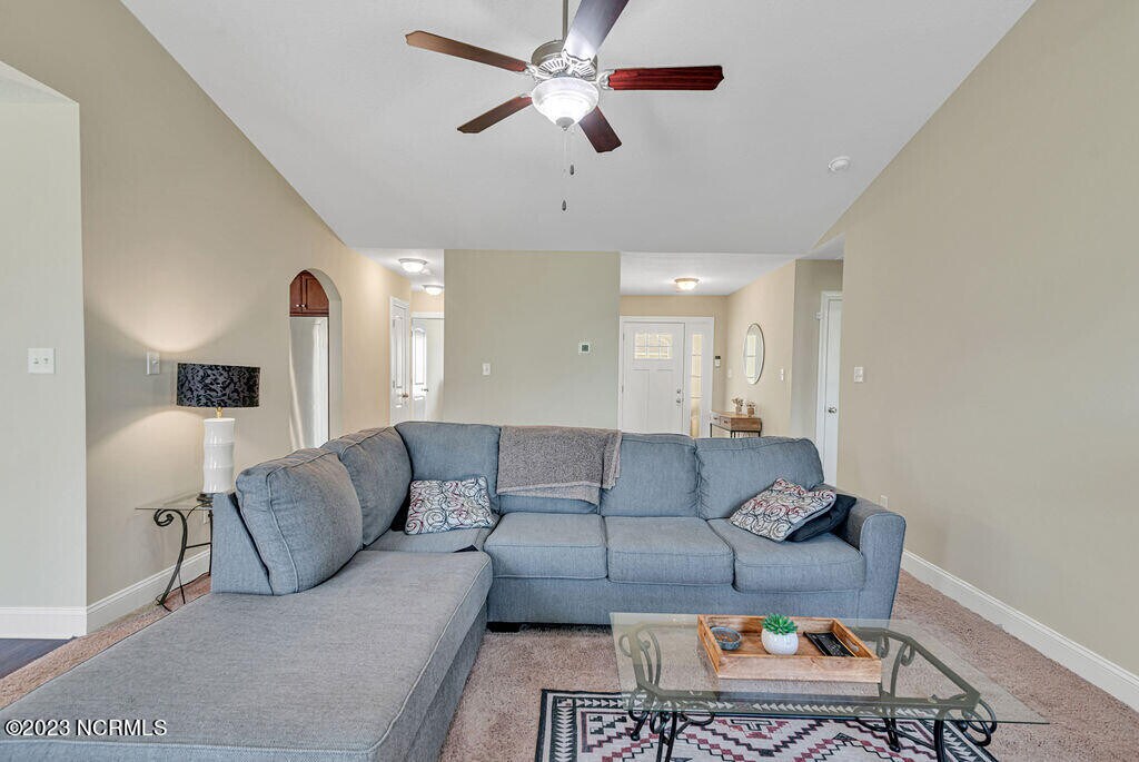 Welcome Home! This home features 3 bedrooms and 2 full bathrooms. Walk in the foyer into the open living area featuring vaulted ceilings, ceiling fan, and a cozy electric fireplace surrounded by marble and topped with a custom mantle. The chef in the family is sure to fall in love with the kitchen with lots of cabinet and counter space, a bar for extra seating, stainless appliances to include a refrigerator, smooth-top range, microwave and dishwasher. The primary suite features trey ceilings, ceiling fan, a HUGE walk-in -closet, and a double vanity, separate shower and soaking tub in bathroom. Located in beautiful Paradise Point in Onslow Bay subdivision! Enjoy the summer swimming in the community pool! The only thing missing you! Schedule your showing today!