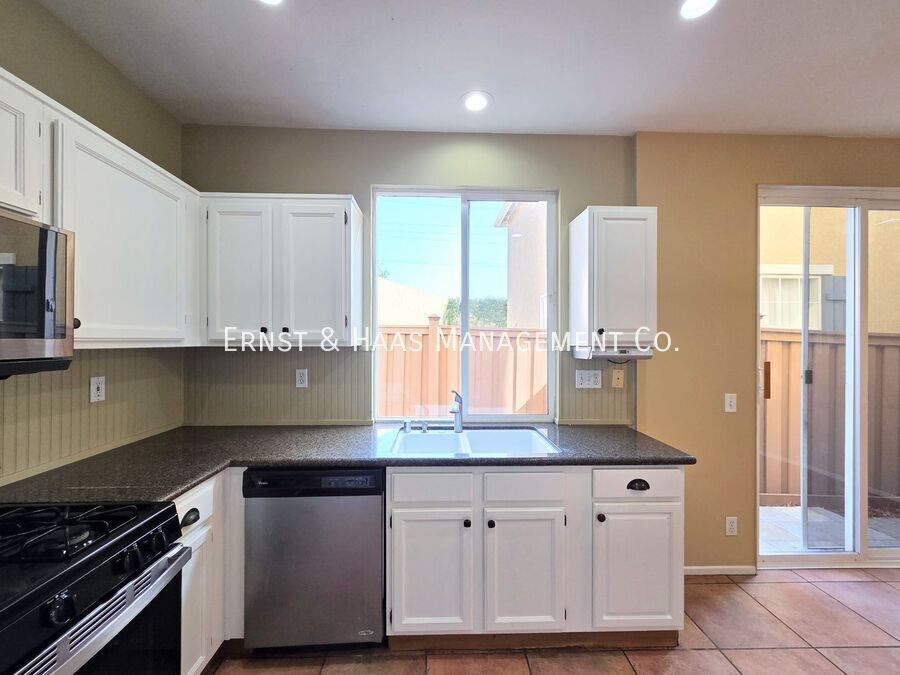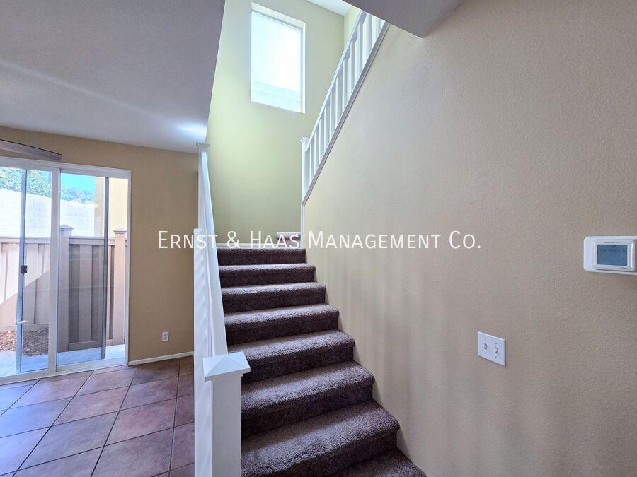 This stunning two-story home is located in a desirable semi-private community in the heart of Orange, offering exceptional comfort and style. The property features a spacious open floorplan, private rear patio yard, and front yard gardening service included. The main entry opens to a bright living area with soaring 12-foot ceilings, elegant tile flooring, a cozy fireplace, guest bathroom, and a large formal dining space. The upgraded kitchen boasts freshly painted cabinets, a stove, microwave, oven, and dishwasher. A large sliding glass door leads to the inviting rear patio, finished with pavers and a rock planter—perfect for outdoor dining or relaxing. Upstairs, a large open den provides an ideal space for a home office or study. All three bedrooms are generously sized, with the primary suite featuring a huge walk-in closet, dual wardrobe closets, and an ensuite bathroom with dual sinks, a shower, and a private water closet. A second oversized bathroom serves the additional bedrooms. Additional features include plush carpeting throughout the upper level, central air conditioning and heat, an upstairs laundry area with washer and dryer hookups, curtain rods on all windows, and a large attached two-car garage with remote access. This home combines space, comfort, and a prime location—offering the perfect setting for modern Southern California living. For more information, or to schedule a viewing for this property, please call or text Joanna at , or visit us online at