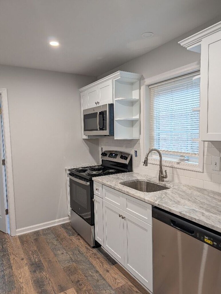 Beautiful 3-bedroom one & half bath home. This home is a three-story Single-Family Home, featuring 3 bedrooms and 1.5 bathrooms. The bedrooms feature carpet and nice closet space. The nicely sized Living room is separate from the dining & kitchen has an open concept with recessed lighting. There is vinyl wood plank flooring throughout the living room, hallway and kitchen. Granite countertops, Stainless Steel Appliances: Fridge, Stove, Dishwasher and Microwave all new to the home. The back entrance has a mud room/ laundry area as the room has washer and dryer hook up. The bathroom features tiled flooring and a large walk-in shower. There is a deck off of the back of the home perfect for eating outside. The covered front porch is perfect for relaxing and watching folks go by. The home has new central A/C and forced air oil heat. We welcome anyone make this home their own. Easy access to shopping and local parks.