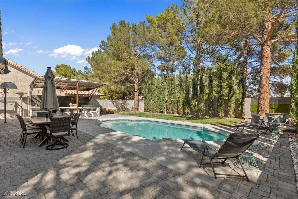 FULLY FURNISHED and MOVE IN READY - LOCATION - LOCATION - LOCATION - Live in paradise! This beautifully furnished and professionally decorated home features vaulted ceilings, a contemporary kitchen with granite countertops, and stunningly remodeled bathrooms. Located in a quiet cul-de-sac, the property offers a large, private backyard with a sparkling heated pool, an outdoor kitchen with a spacious bar, and plenty of cozy spots to relax. Ready to move in! Due to the home’s security system, showings are by appointment only.
