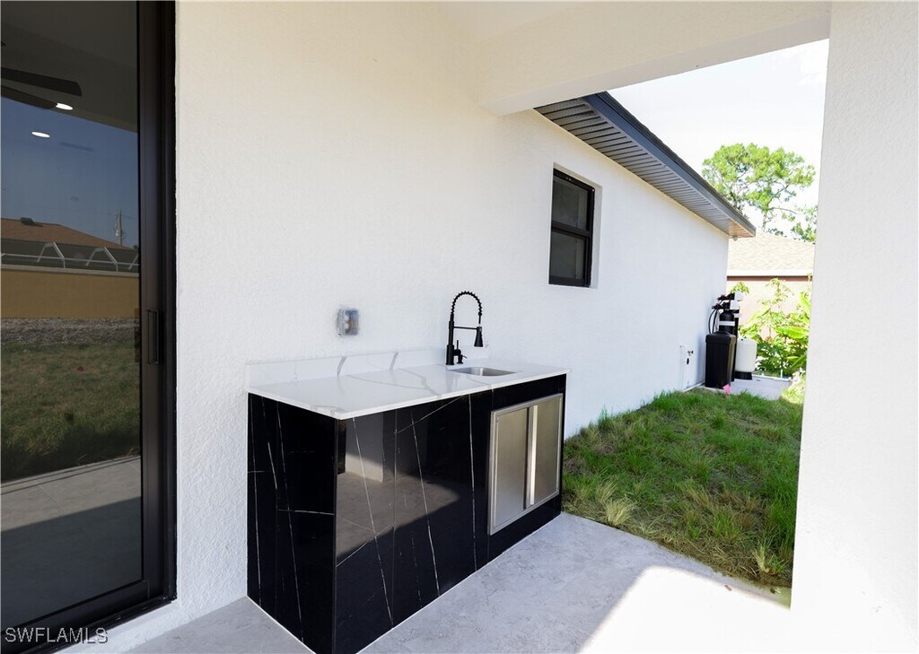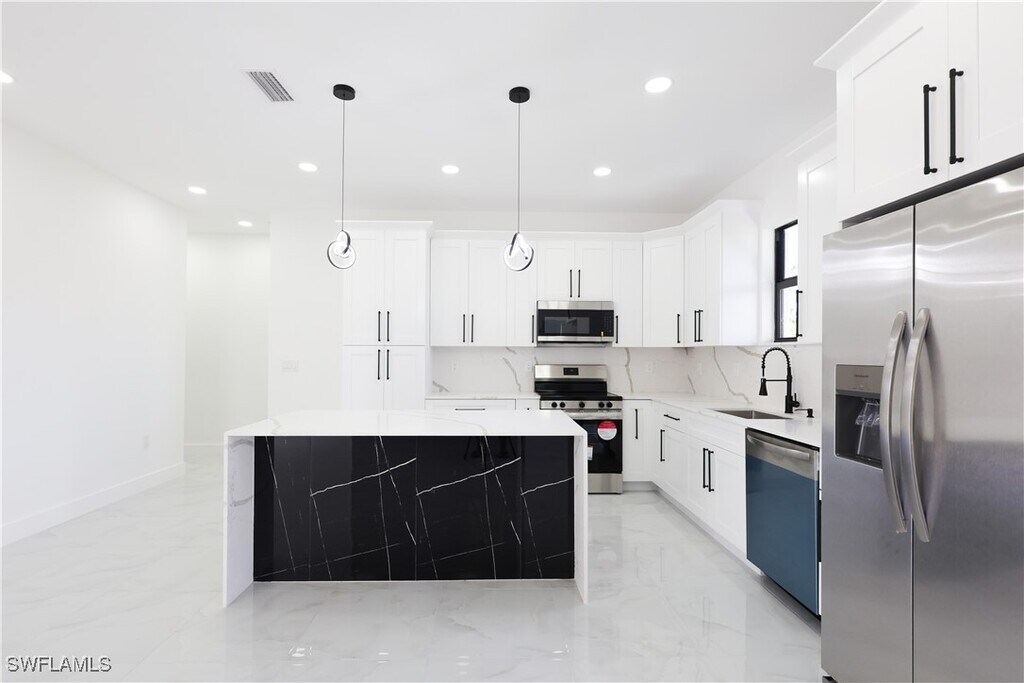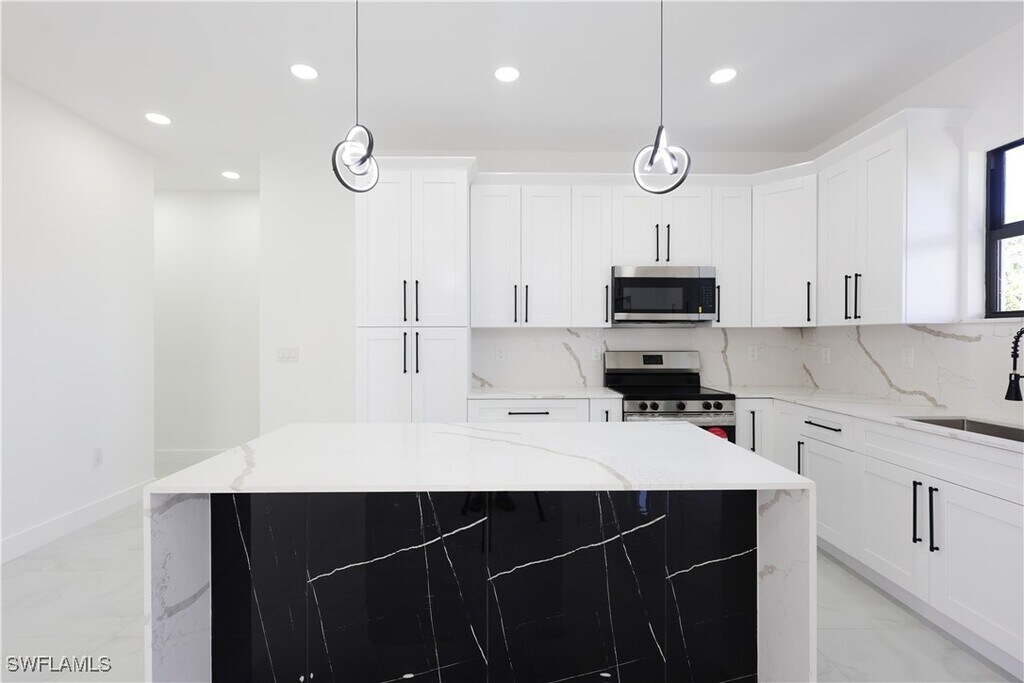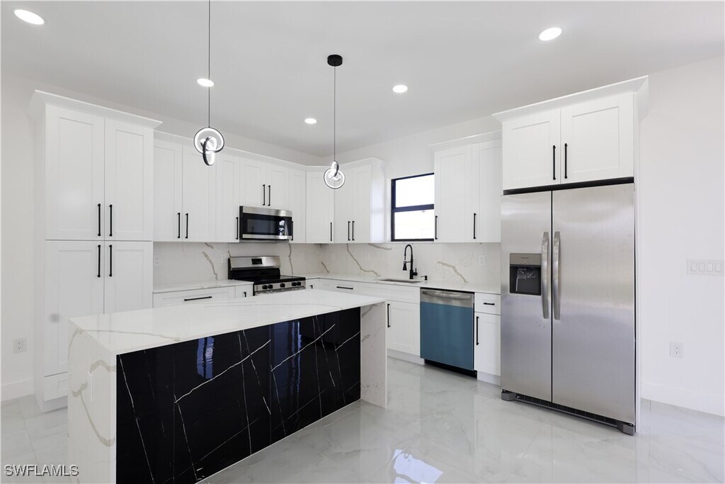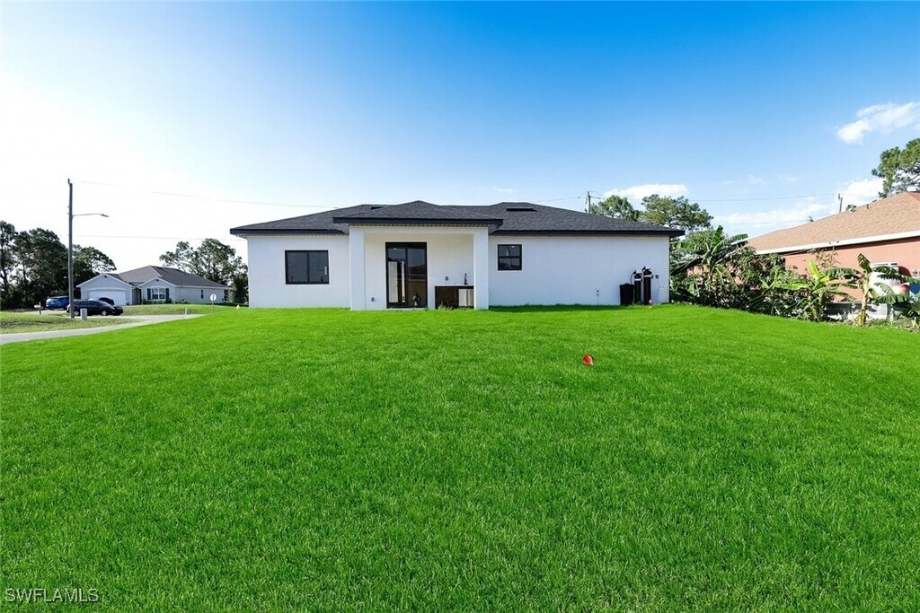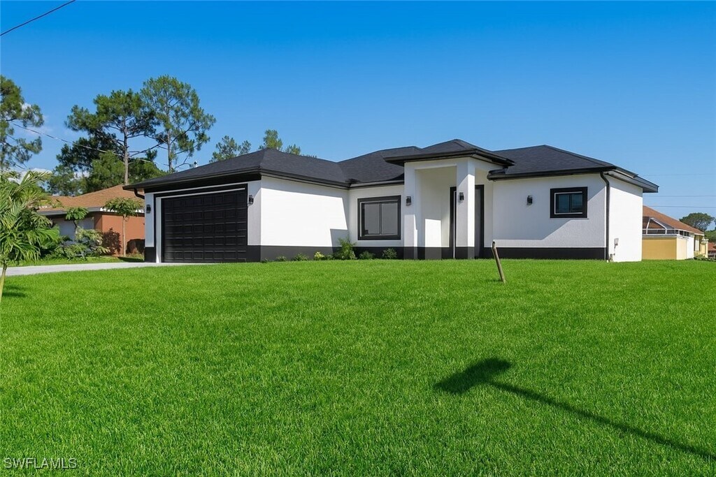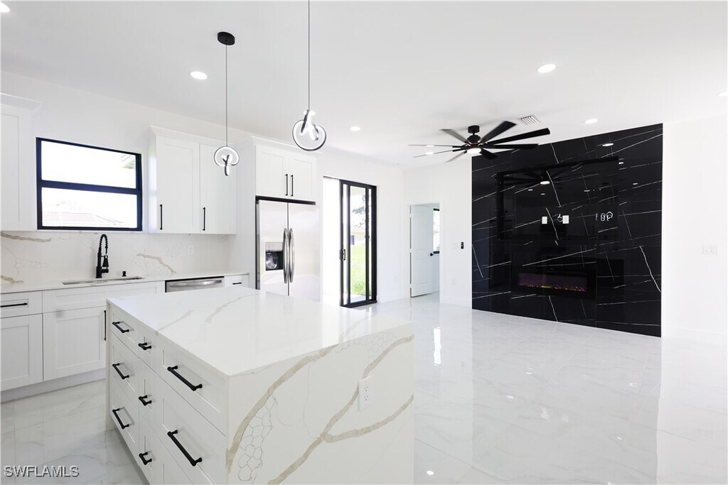 LOCATION,LOCATION,LOCATION! This newly built corner home offers modern design,high-quality finishes,and exceptional comfort. With 4 spacious bedrooms and 2 full bathrooms,this property features tile flooring throughout for a clean and elegant look. The open-concept living area includes a modern fireplace and stylish design details that make the space unique. The gourmet kitchen features a beautiful waterfall island,premium finishes,and a layout perfect for cooking and entertaining. Enjoy peace of mind with impact-resistant windows and doors,LED lighting,ceiling fans,and a security camera system already installed. The two-car garage includes epoxy flooring for extra durability,and the porch and terrace provide comfortable outdoor areas to relax. Located in one of the most desirable areas of Lehigh Acres,just 17 miles from Fort Myers International Airport,with easy access to shopping,dining,and major roads.