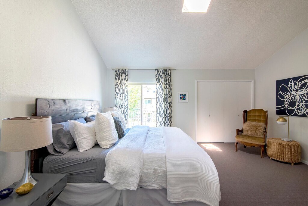 8 month lease! Enjoy incredible mountain views from this 2-bed, 2-bath townhome in the Google corridor of Northeast Boulder. This large corner unit boasts 1,502 sqft of living space, an oversized back patio and a covered attached carport. Step inside to a sunny dining room; a clear wave glass block wall divides the dining nook from the kitchen, where a granite countertop extends for additional seating. Clean white cabinets and stainless steel appliances wrap around the kitchen to the built-in cabinet space for storage. Past the kitchen, walnut floors flow through to a large living room with a wood-burning fireplace and sliding doors to the private covered patio. Upstairs, a primary bedroom features an en-suite bathroom and its own private deck. Crowning the home is the upstairs loft, complete with 3 skylights and more built-in shelving.