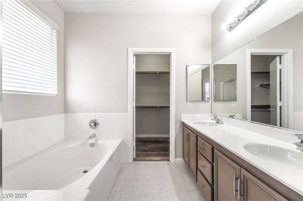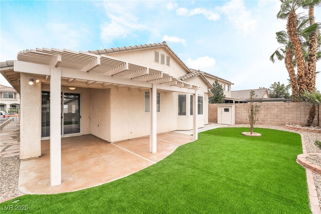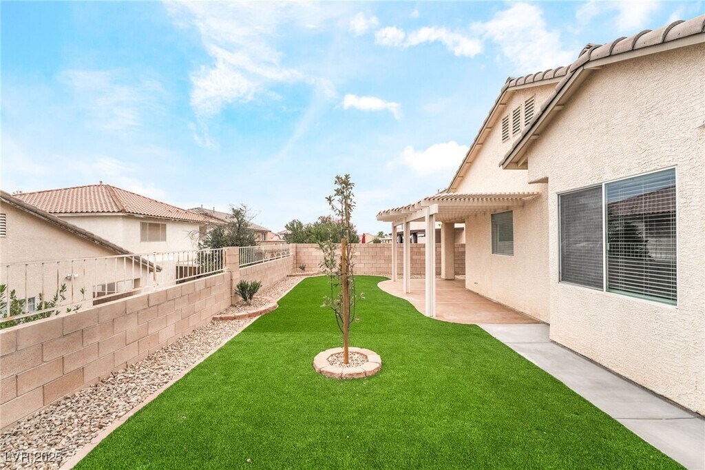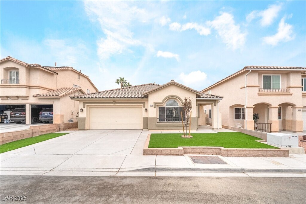 This single-story home features tile flooring throughout the main living areas and a kitchen with a breakfast bar and appliances, perfect for everyday living. The spacious living area flows seamlessly, while the master suite offers a private bath with dual sinks, a standing shower, and a separate tub. Additional bedrooms are generously sized, and the backyard is beautifully designed with low-maintenance artificial turf, ideal for relaxing or entertaining.