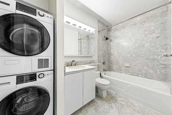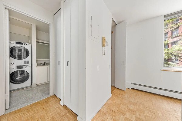 Experience sophisticated city living in this oversized 1-bed, 1-bath condominium at the desirable Greenwich Court in the heart of Tribeca. Featuring approximately 815 sq ft of living space, this home boasts a renovated pass-through kitchen with granite countertops, stainless steel appliances, and beautiful cabinetry. The unit offers great closet space with custom California closets, and an in-unit full-size washer and dryer for added convenience