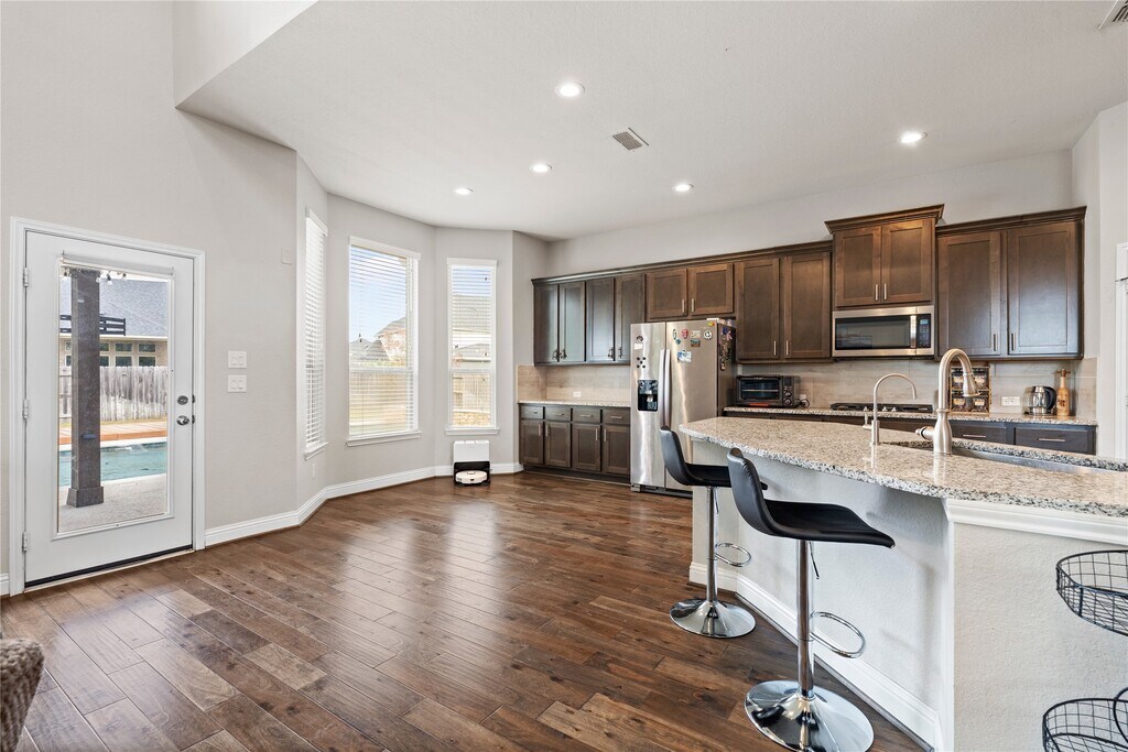 Discover simple,stress-free living in this stunning 5/6 bedroom,4.5 bath home featuring hardwood floors,custom cabinetry,high ceilings,granite countertops and an open-concept layout. ENJOY INCLUDED AMENITIES: lawn/pool maintenance,resort-style backyard & pool w outdoor shower,pest maintenance,high-speed internet,a Solar/Tesla Powerwall system offsetting annual electric costs and ensuring outage protection,whole-home water softener with reverse osmosis at the kitchen,fully equipped media room and a backyard mosquito system for bug-free outdoors. Nestled in the family-oriented Young Ranch Neighborhood,zoned to top-rated Lamar Consolidated ISD schools. Community perks include a state-of-the-art rec center with fitness area,outdoor kitchen,meeting rooms,pools,parks and walking trails. Nearby,the $400M Texas Heritage Marketplace brings shopping,dining,entertainment,EOS Fitness Gym & new HEB and Target stores 1.5 miles away. Schedule a showing today! MLS# 48009176