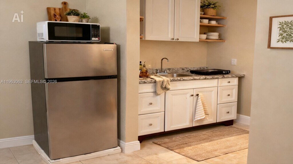 Enjoy the ultimate Palm Beach lifestyle in this beautifully updated, turnkey efficiency featuring a spacious bathroom. This bright unit offers a modern kitchenette with granite countertops, stainless steel appliances, and chic open shelving. The living space is highlighted by a custom recessed headboard wall with integrated lighting and neutral tile flooring throughout. Step outside to your fenced-in private patio, perfect for enjoying coastal breezes. An oversized closet and a dedicated reserved parking space complete this efficient and stylish retreat. MLS # A11963062