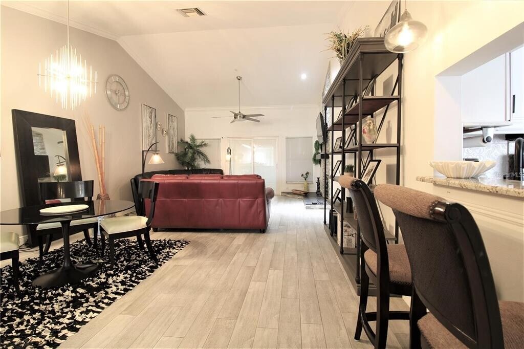 Come view this 3 bed,2 bath townhome located in the Golf-gated Community of Ventura Country Club. This gated community provides additional security with a manned officer at the entrance. This end unit is recently renovated with high-end appliances and features a chef’s kitchen with plenty of natural light. The home includes a large covered porch and a private balcony overlooking pristine nature views. Upgraded/luxury tile wood flooring can be found throughout. The vaulted ceilings create a spacious and open feel. In the living room,you’ll find glass doors that provide abundant natural light and a beautiful view of the outdoors. The master suite is designed for relaxation with a large soaking tub,dual sinks,a walk-in shower,and modern flooring that completes this exquisite space. Inside the master en-suite,you’ll also find a custom closet. The gourmet kitchen features high-end stainless steel appliances,granite countertops,a closet pantry,and an eat-in area with a large window. This split floor plan allows maximum privacy with two additional bedrooms and a bathroom on the opposite side of the home. Enjoy all the resort-style amenities including an 18-hole golf course,clubhouse,fitness center,swimming pool,and much more! Easy access to major highways (I-4,408,417),making it ideal for commuters and retirees. Washer and dryer included. Available now! Pets OK (25 pound HOA pet limit) with $350 deposit ($150 refundable). Qualifications: Income 3X rent,credit score of 600 plus,and background checks,HOA Application. Equal Opportunity Housing. MLS# O6389702